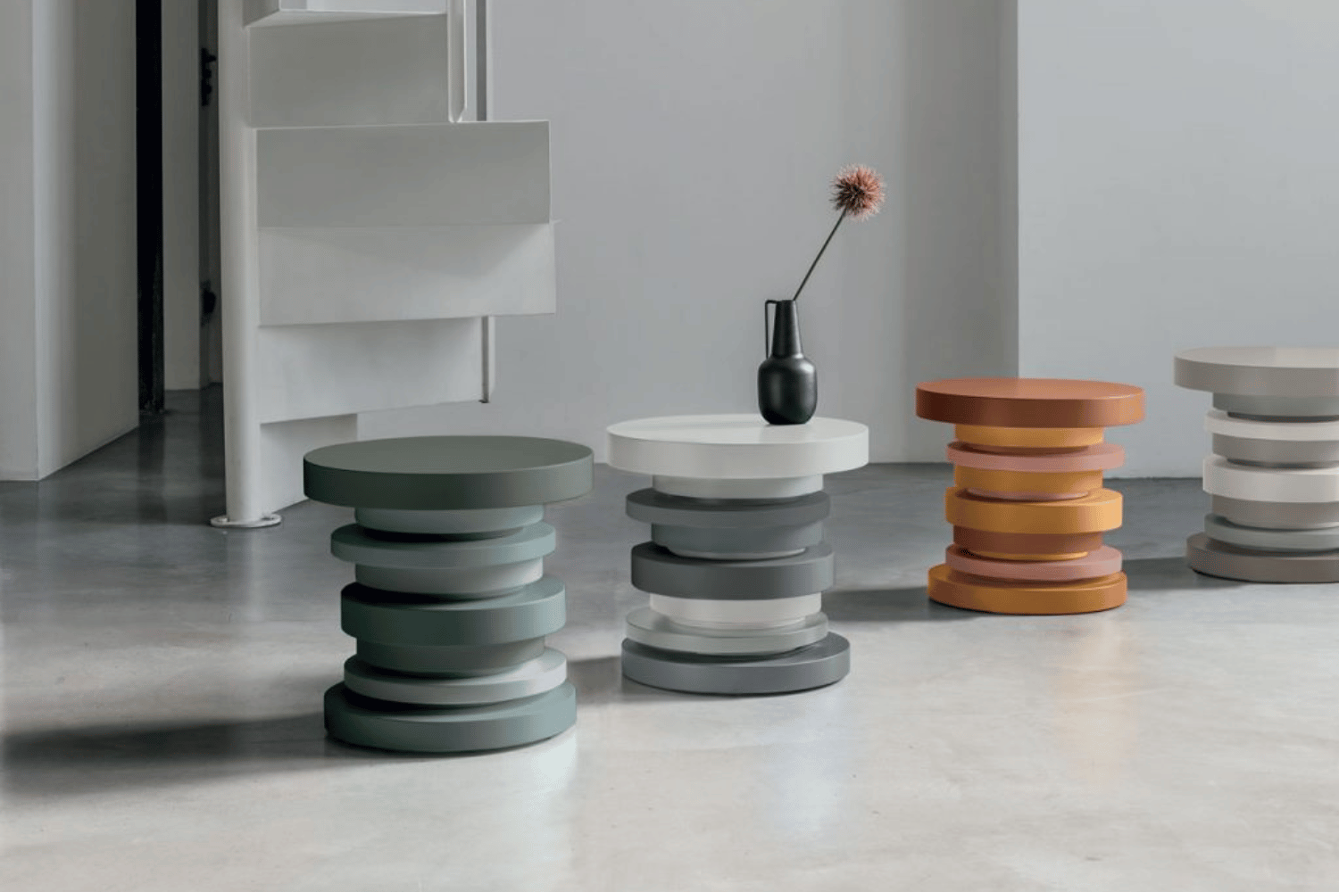 A modern coffee table with a playful and versatile design, perfect for any interior style. Featuring overlapping round tops in various sizes and colors, it becomes a dynamic focal point that brings personality and charm to any room.
