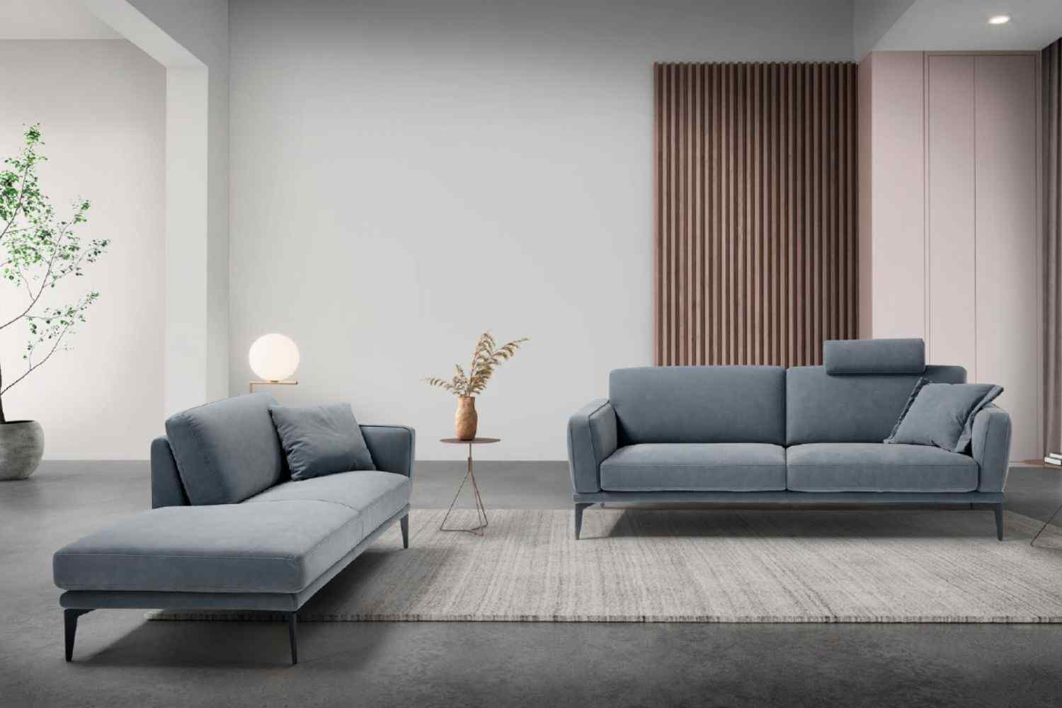 Agiamo is characterized by simple and slender lines enhanced by the thin metal foot. Its profiles is further enhanced by the tailored detail of the double seam along the slightly inclined armrest. Whether in fabric or leather cover, Agiamo is very versatile and adaptable to any context, thanks to the combination of modules including a chaise lounge and the function of its headrest that can be positioned on the backrest for extra comfort.