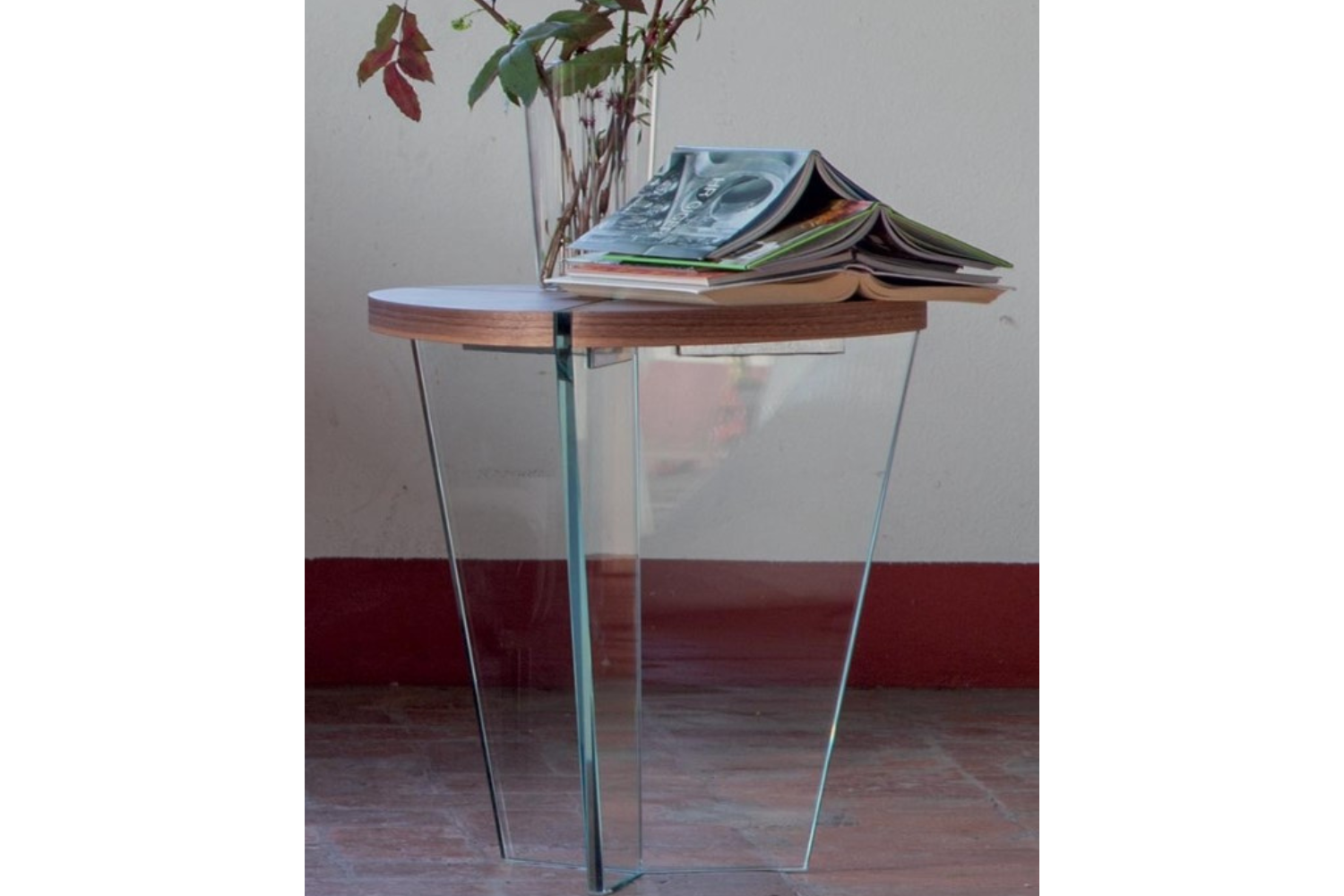 This side table offers a floating effect that adds an air of mystery and elegance to its surroundings. Its unique character shines through a masterful combination of inlaid glass and wood, achieving the highest level of originality. A perfect addition to any modern home, it seamlessly complements contemporary furnishings with its sophisticated desig
