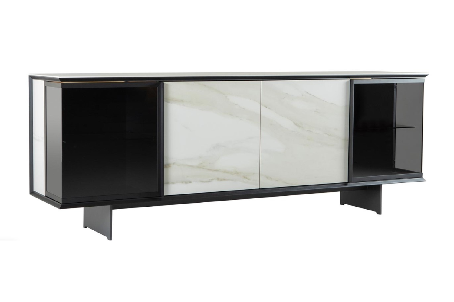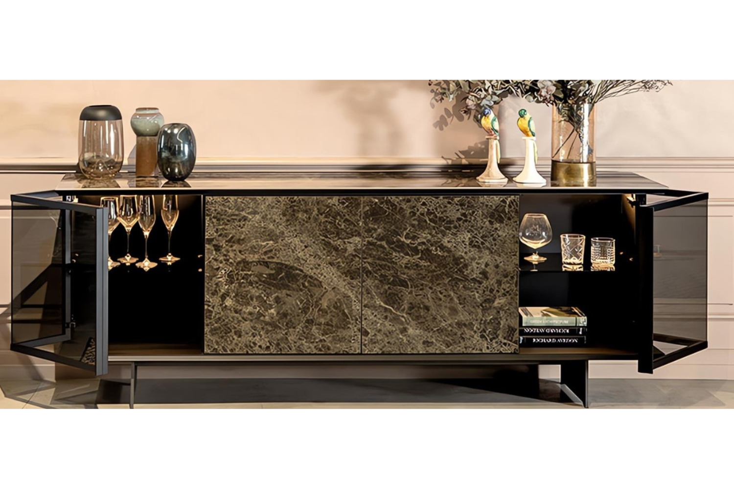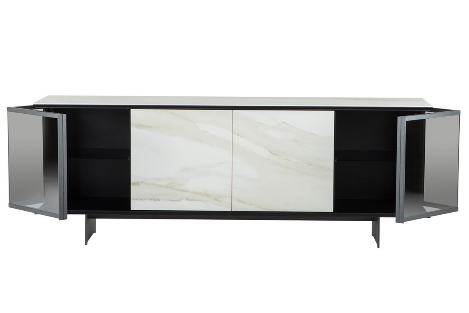 The Airy sideboard is the perfect blend of style and functionality for modern living. Its luxurious porcelain finish on the center doors, top, and half of the sides adds an elegant touch. Flanking these porcelain doors are two glass-compartmented sections that create a striking visual contrast. Use the hidden central compartment for personal items, while showcasing your more decorative pieces behind the glass doors for an aesthetically pleasing display. For an added touch, consider the optional LED light kit to beautifully illuminate your treasures