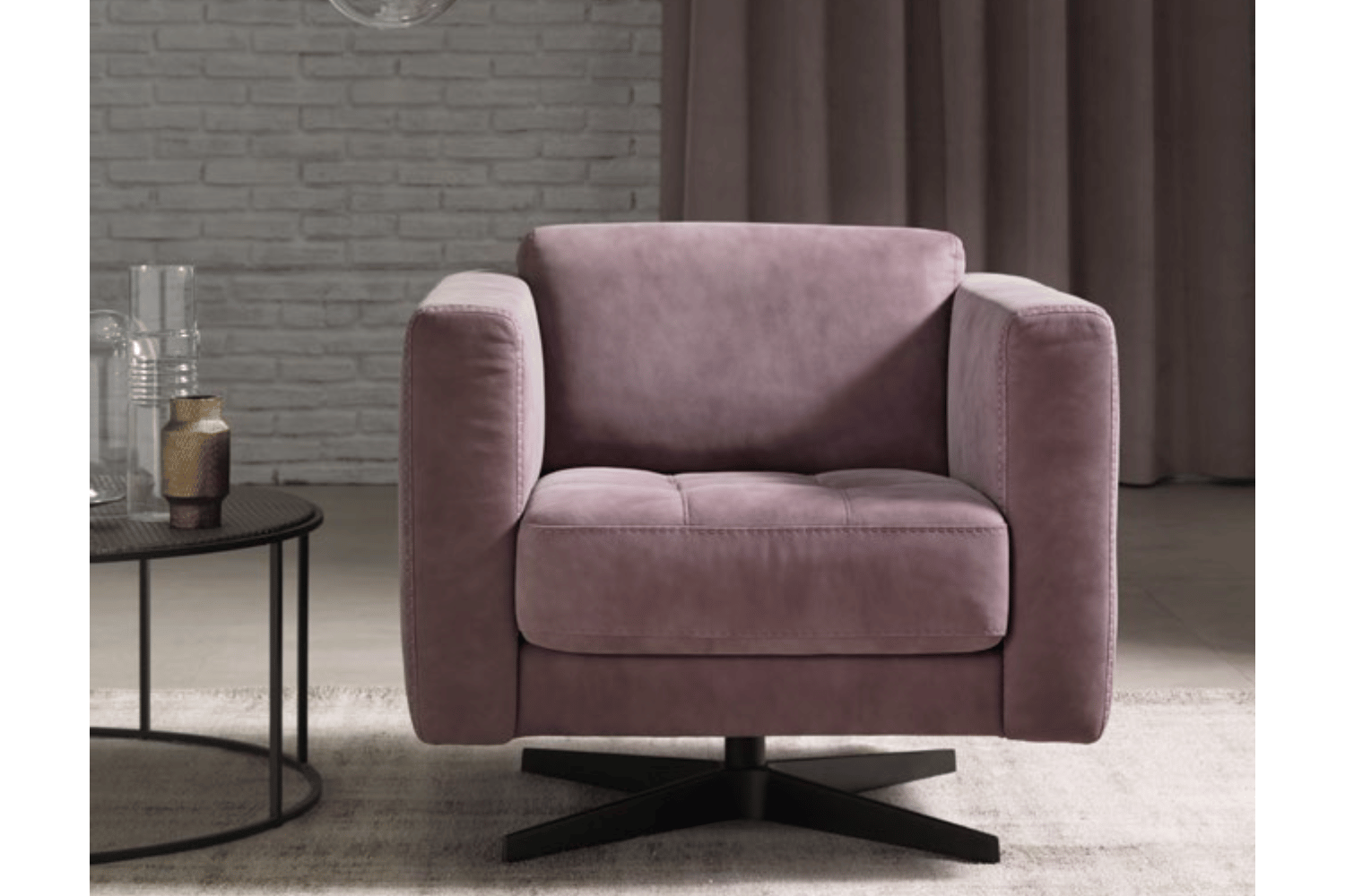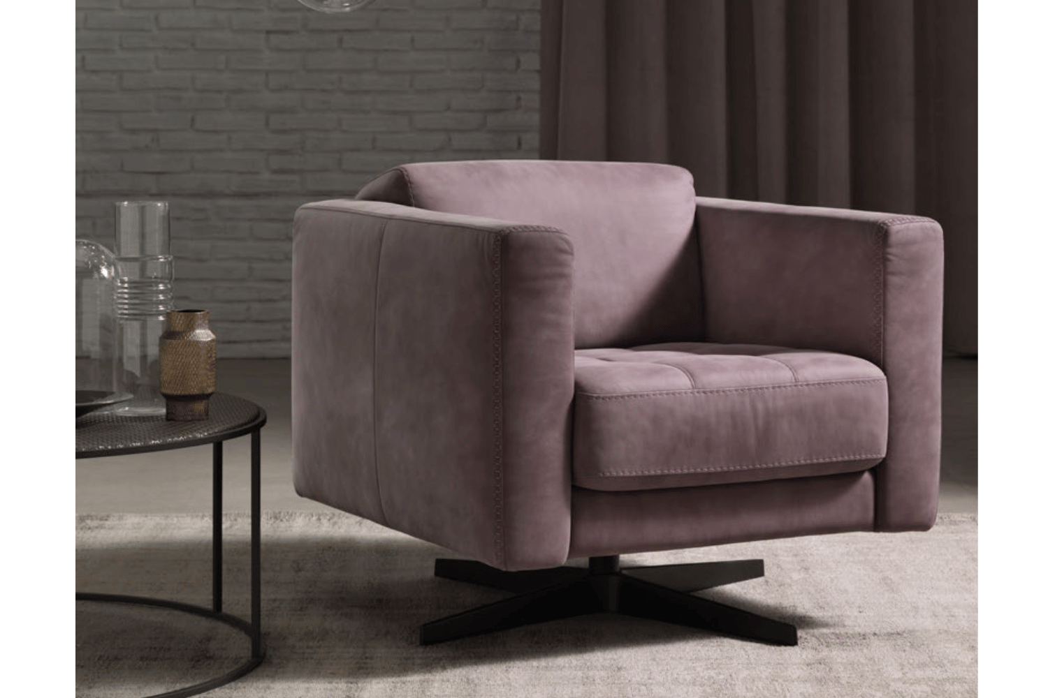 Firm in its squared lines and comfortable on its seating, Alfini with sloping backrest, is held up by metal feet. Tailored details as for the quilted seat cushions and contrast stitching enrich this delicate and essential armchair, available with leather o fabric cover.