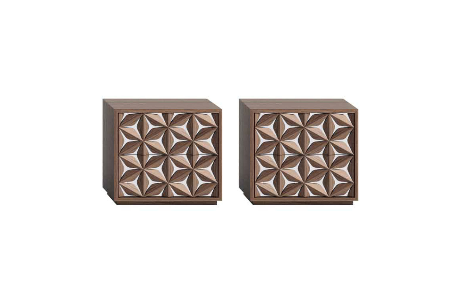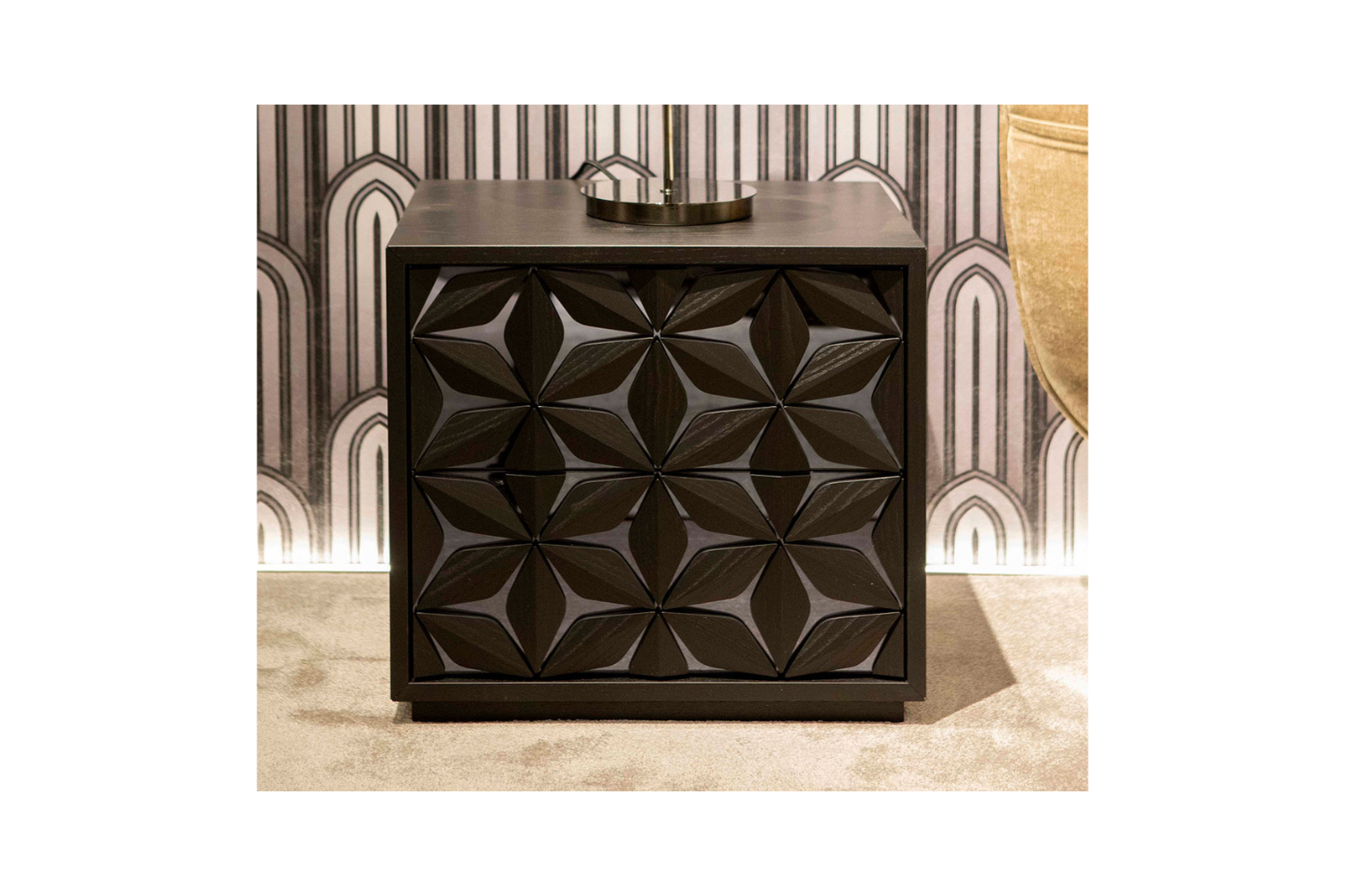 Bring sophistication and functionality to your bedroom with the Alistar Night Nightstand, an elegant addition to modern spaces. Hand-applied wooden petals, carefully arranged, create a striking kaleidoscopic effect, while the mirrored finish behind them adds an enchanting touch of style. Featuring two deep drawers, this nightstand offers ample storage for your essentials, keeping your space neat and organized. The spacious top surface provides the perfect spot for an alarm clock, lamp, or decorative accents, making it both a practical and visually stunning choice for your bedroom.