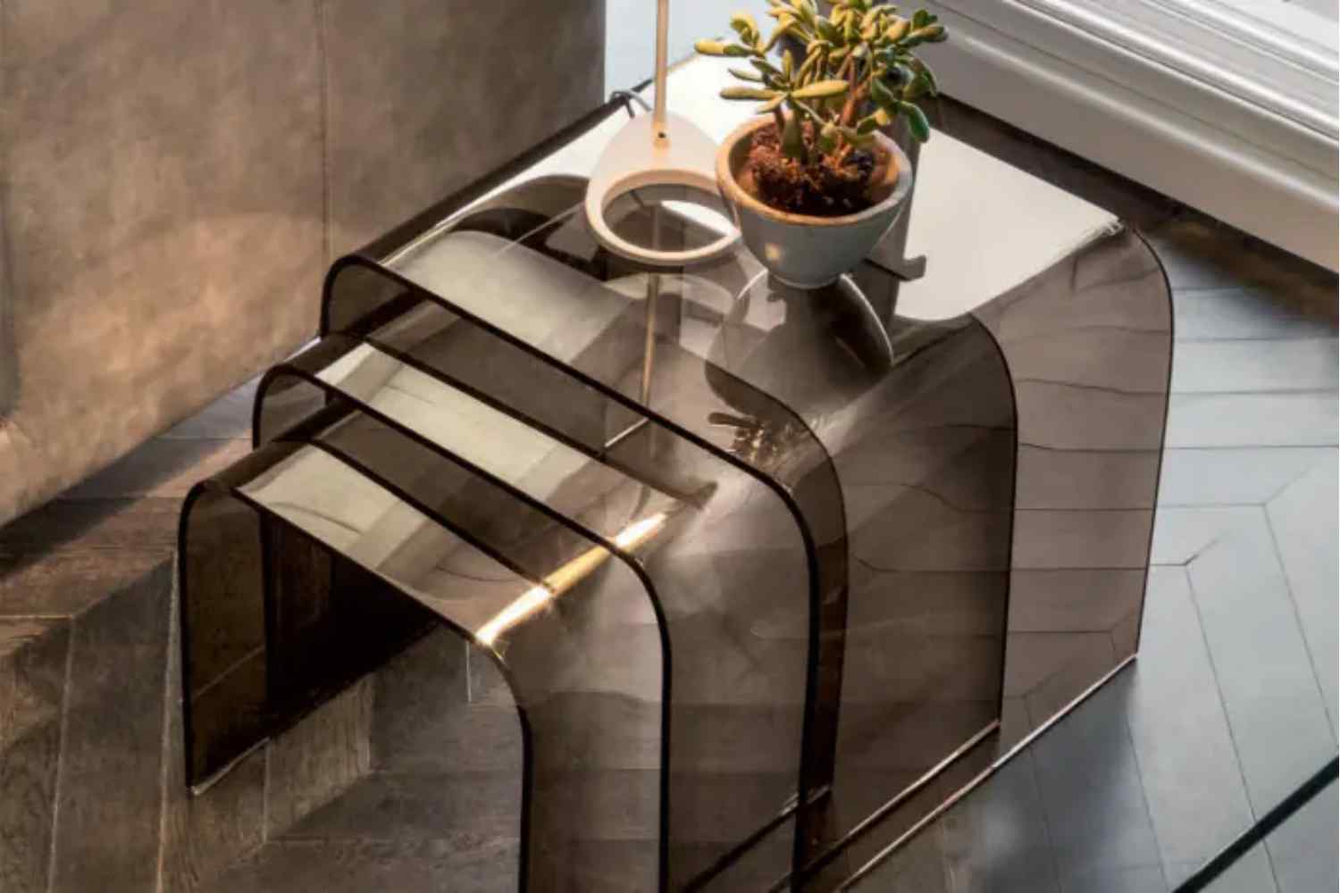 Drawing inspiration from the aquatic plant it is named after, Anemone combines transparency in its forms while concurrently concealing and safeguarding a storage area tailored for your most cherished ornaments. The design incorporates a curved glass structure enveloping either the wooden or glass shelf, introducing a horizontal line that imparts rhythm and complexity to the overall aesthetic. Various versions are available, including individual coffee tables or side tables, as well as sets of three side tables.