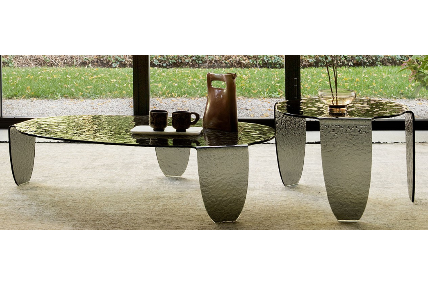 A true statement piece, this striking table is crafted from a single sheet of glass, elegantly curved and supported by bold legs. Its hammered finish adds a rippled texture, bringing dynamic energy to any room. As a captivating focal point, it effortlessly unites your seating area, providing a chic surface for decor, refreshments, or reading materials while you unwind.