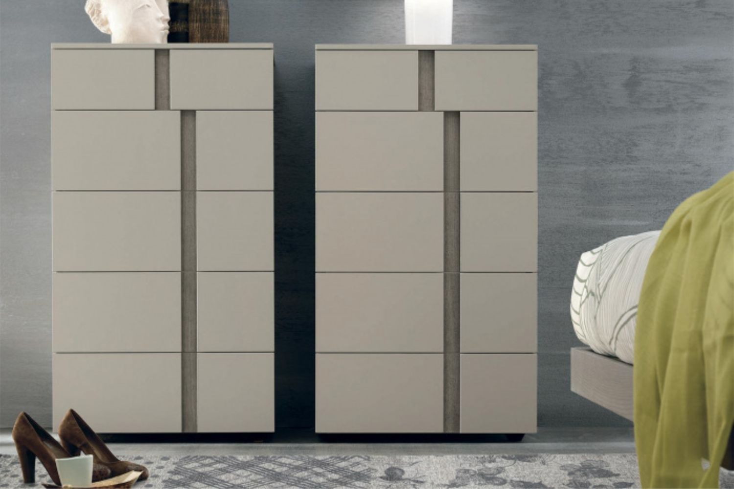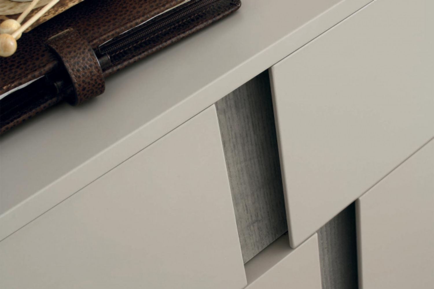 The vertical handle inserts on the fronts of the Athena furniture draw decorative, graphical lines that can be customised in various finishes or colours.