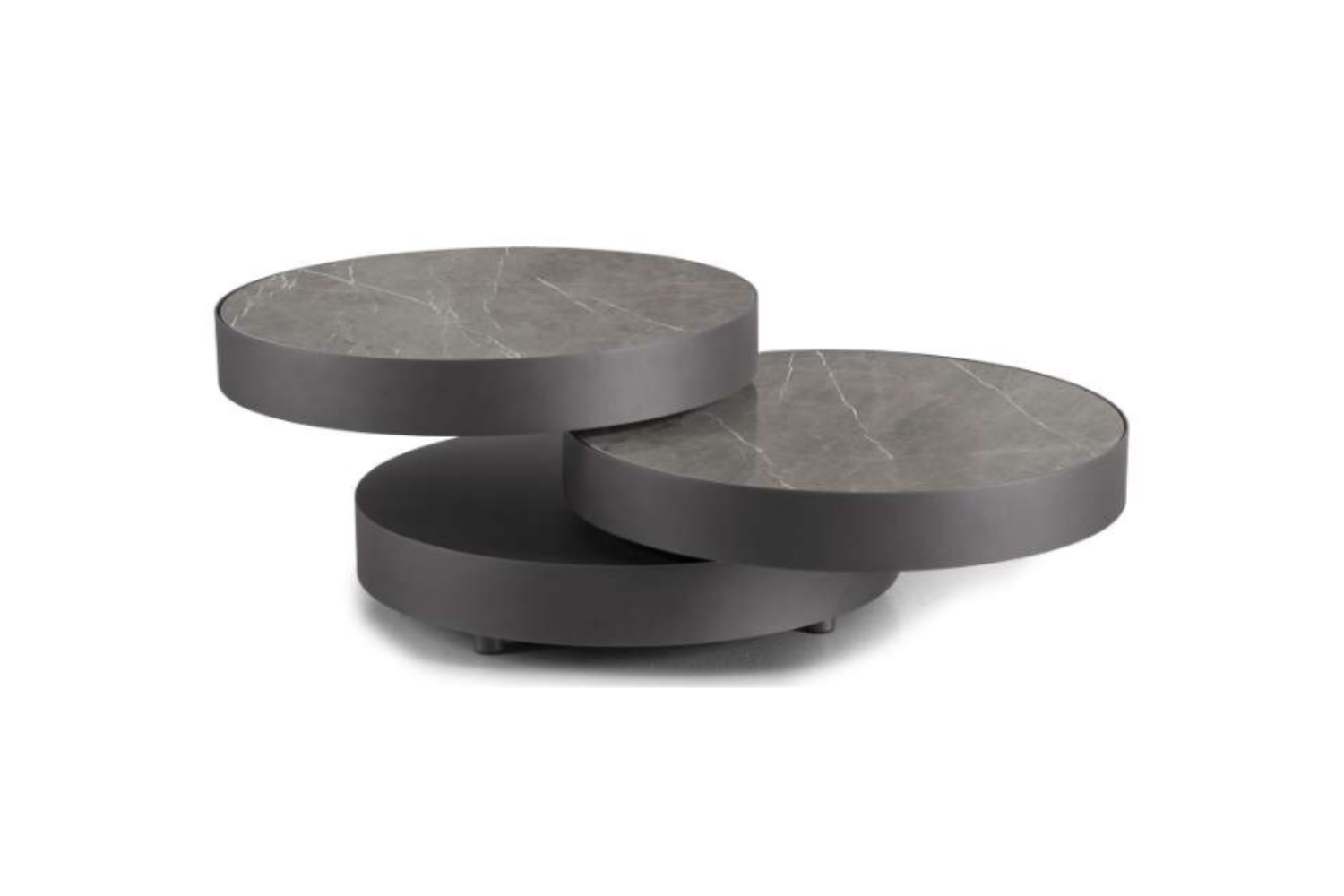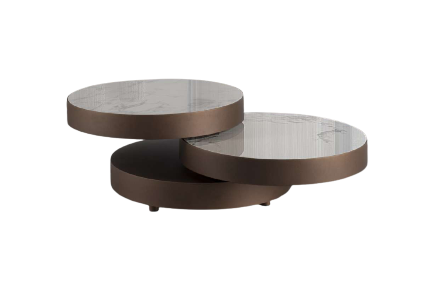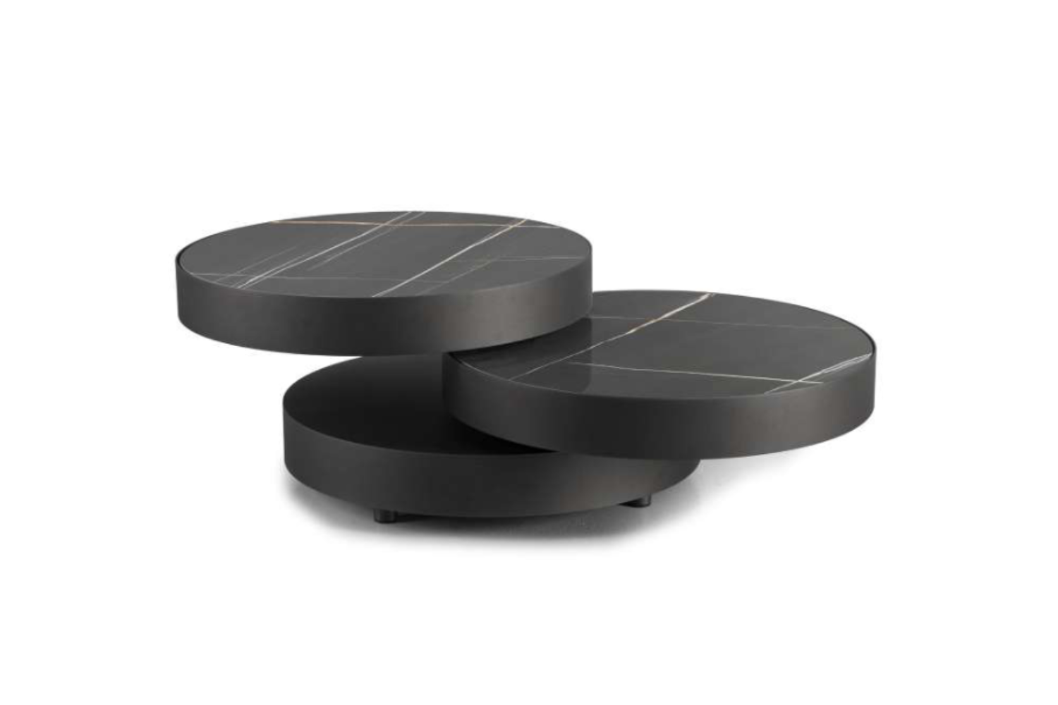 AURORA ROUND | Extendable Cocktail Table Aurora Round is a multifunctional cocktail table available in both round and square silhouettes, designed to elevate modern living. Topped in refined ceramic finishes and grounded by a sculptural painted base with integrated drawers, it offers both beauty and utility. A seamlessly engineered mechanism allows the two tops to open in perfect synchronicity—revealing hidden storage with a smooth, effortless motion. An elegant expression of Italian design versatility.