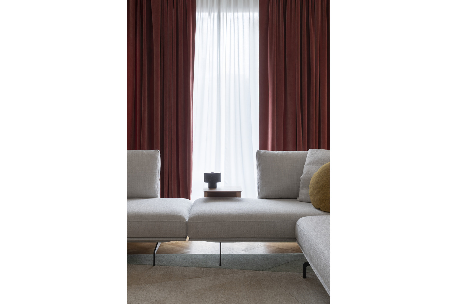 Flow, adapt, create void, rearrange space, receive, and renew indefinitely the new Avant-Apres seating, designed as a lateral sofa, is a testament to boundless versatility. Rigid yet lightweight, this lateral sofa introduces captivating configurations through its special armrest/backrest system, which effortlessly detaches with a simple movement, allowing for flexible positioning all along the base. This unique feature inspires a daily pre-and-post dance, fueled by the desire to experiment and try something new. Avant-Apres, with its lateral sofa design, exudes a sober allure and an elegant appearance. It is gracefully placed on a metal base upholstered in fabric or leather and supported by metal feet. The addition of a chaise enhances its adaptability and comfort, providing an extra layer of versatility to the configuration. Refined accessories complete the system, featuring side tables in two different sizes. The fully removable covers add a practical touch, facilitating convenient maintenance and ensuring a perpetually fresh and updated look. Avant-Apres is not just a sofa; it's an invitation to reimagine and redefine your living space each day, offering both style and functionality in one captivating lateral ensemble. With its innovative design and thoughtful details, Avant-Apres sets the stage for a dynamic and ever-evolving living experience.