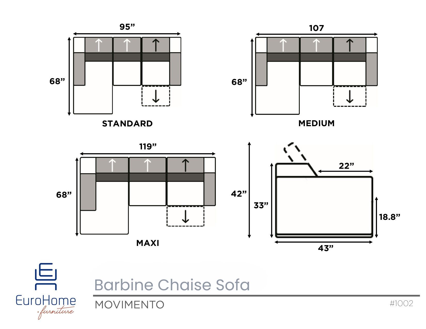 The Barbine Chaise Sectional transcends the realm of mere seating solutions; it extends an invitation to indulge in genuine comfort?a haven where you can unwind, share joyful moments, and embrace the dynamic rhythm of contemporary living. Whether you prefer the simplicity of a manual recliner, the convenience of an electric recliner, the gentle motion of a sled seat, or the tailored support of an adjustable headrest, each feature is meticulously integrated to accommodate diverse lifestyles and preferences. Immerse yourself in an authentic comfort experience with this sectional, where every curve and contour is purposefully designed to provide solace and relaxation. It goes beyond being a piece of furniture, evolving into a vessel for well-being and shared moments. For those desiring additional personalization, the Barbine Chaise Sectional offers alternative leg color options. To explore the full spectrum of choices and customize the sectional to your individual taste, please reach out to us directly. This feature ensures that the Barbine Chaise Sectional seamlessly aligns with your unique style and complements your existing decor. Available in three sizes?Standard, Medium, and Maxi?the Barbine Chaise Sectional caters to various spatial needs, providing flexibility in both design and functionality. It embodies comfort, versatility, and personalized style, adapting to the diverse rhythms of your life.