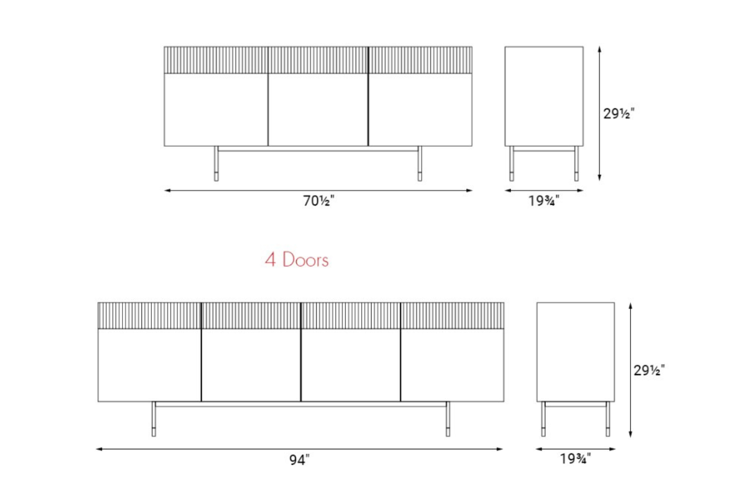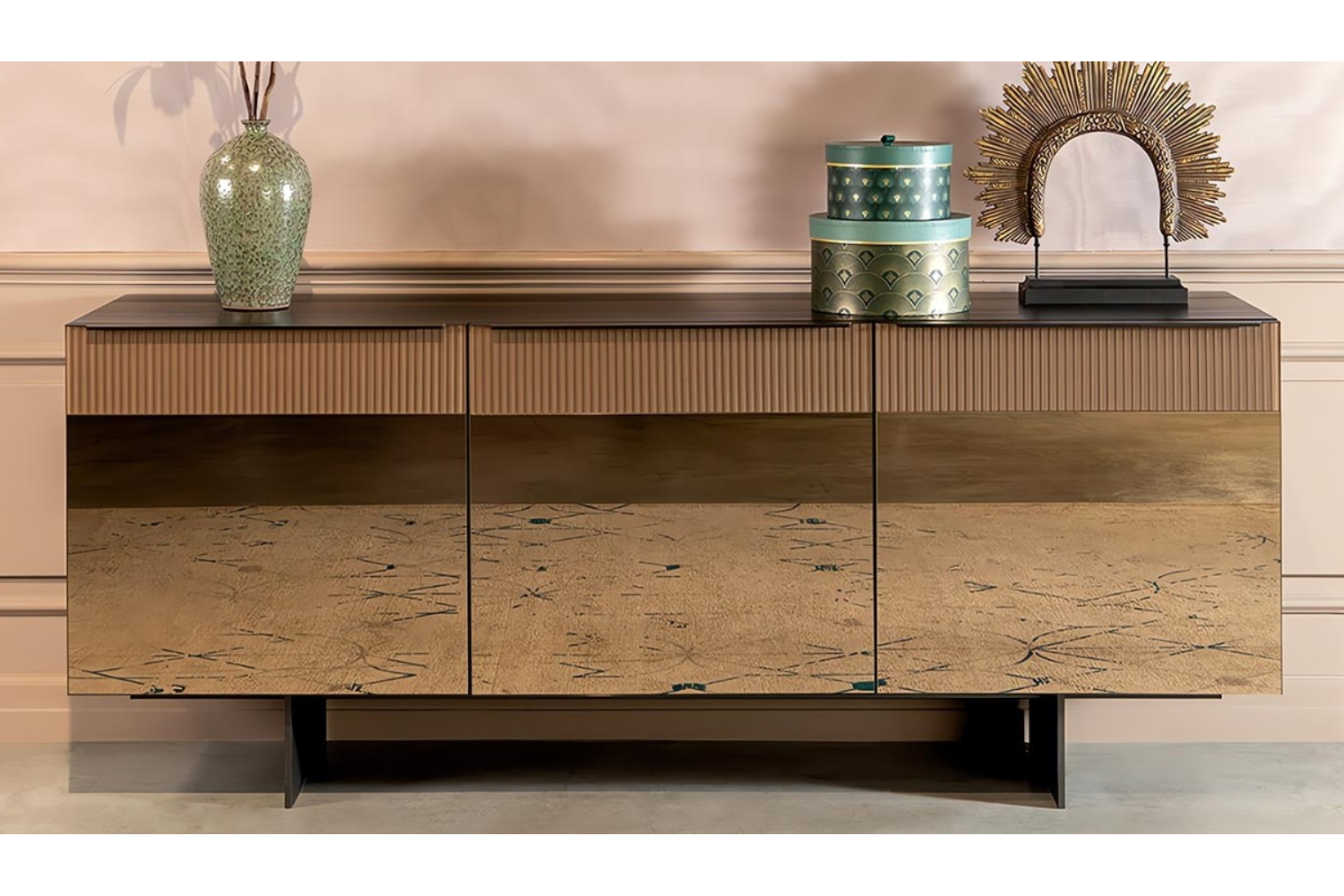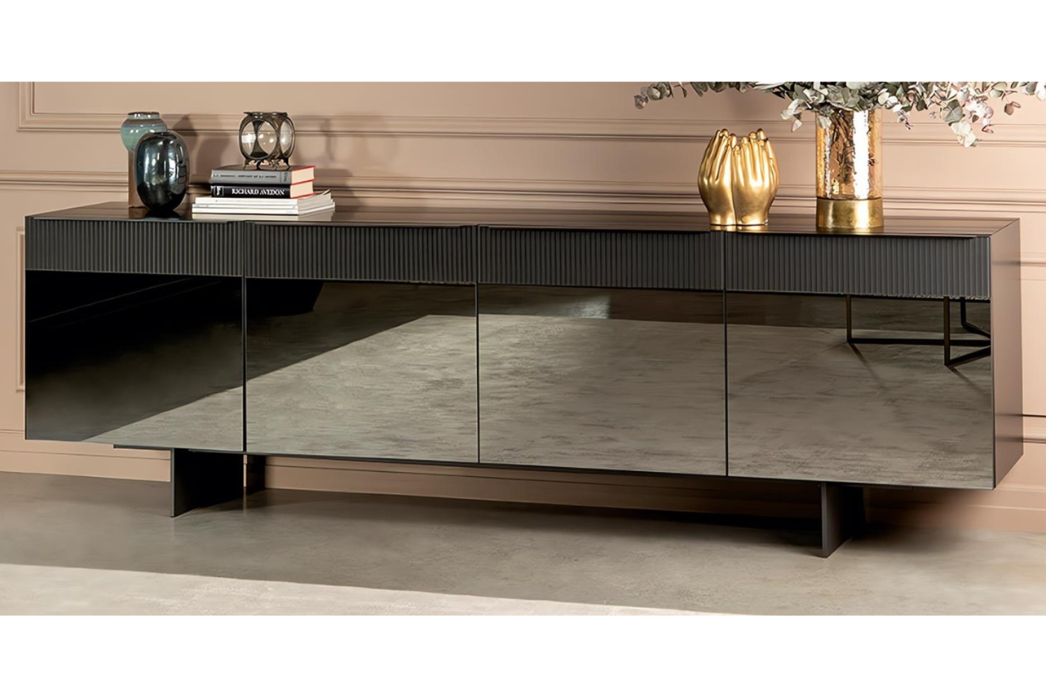 The Cannetta sideboard is an ideal addition to any contemporary home. Its striking mirror doors create a bold statement, complemented by striated detailing along the top that adds intrigue and texture. Beyond its stylish appearance, this sideboard offers ample storage for your belongings, keeping essential items like dishes and cutlery conveniently within reach. Use the spacious top to showcase cherished decor and greenery, enhancing the overall aesthetic of your space.