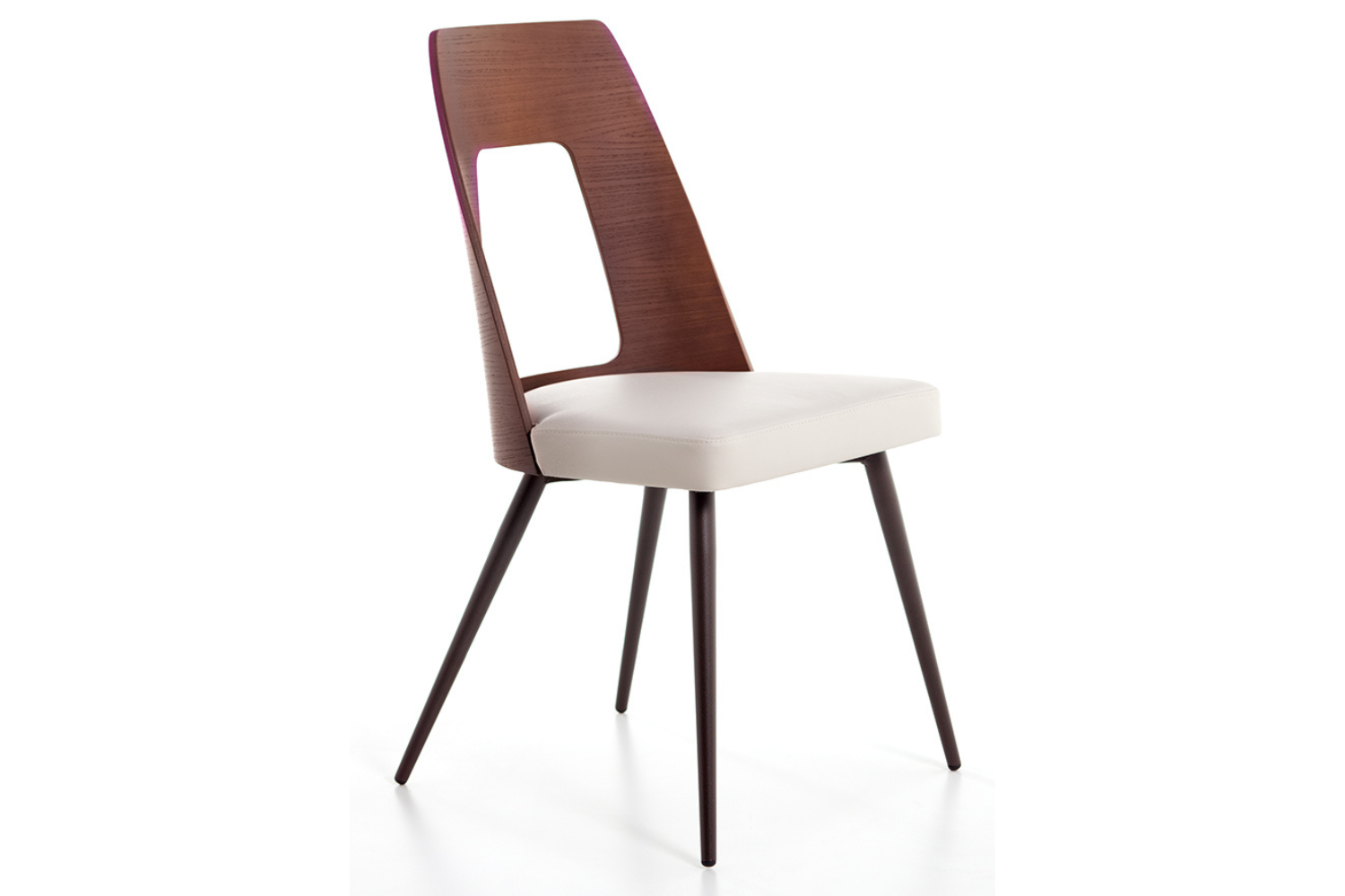 Side chair with plywood seat with polyurethane foam upholstered with fabric, leatherette or leather. Oak Plywood back at sight finished in Natural, Walnut, Burned or Grey ash.