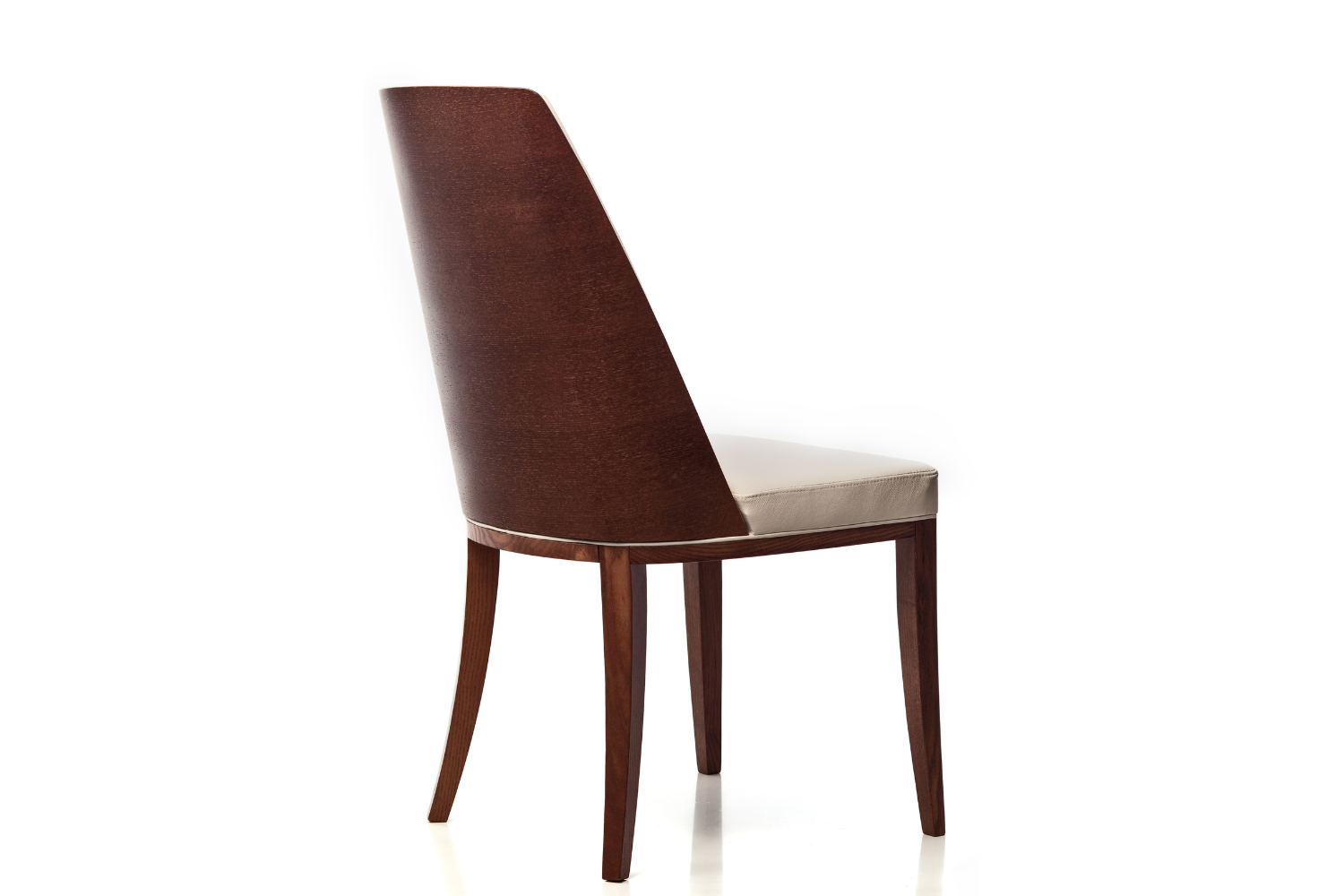 High back chair with ashwood frame, plywood back at sight, polyurethane foam, upholstered with fabric, leatherette or leather, woven seat. Legs available in several finishes.