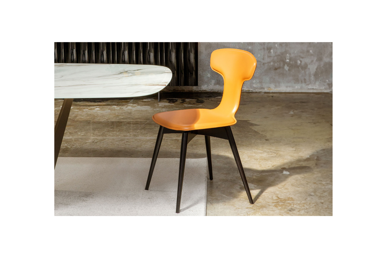 With its striking design, the Delphine Hard Leather Dining Chair stands out as a true statement piece. The unique tail-inspired structure of the seat creates an airy and sculptural profile that adds modern sophistication to your dining space. The T-shape design frames your back beautifully, offering both comfort and support while you relax at the table. The luxurious hard leather finish contrasts beautifully with the sharp, solid wood base, ensuring a blend of elegance and durability. Available in a variety of leather colors and three rustic wood finishes, this chair can be customized to match your personal style.