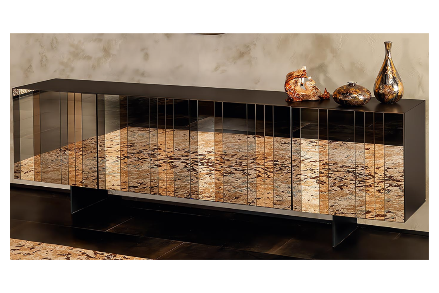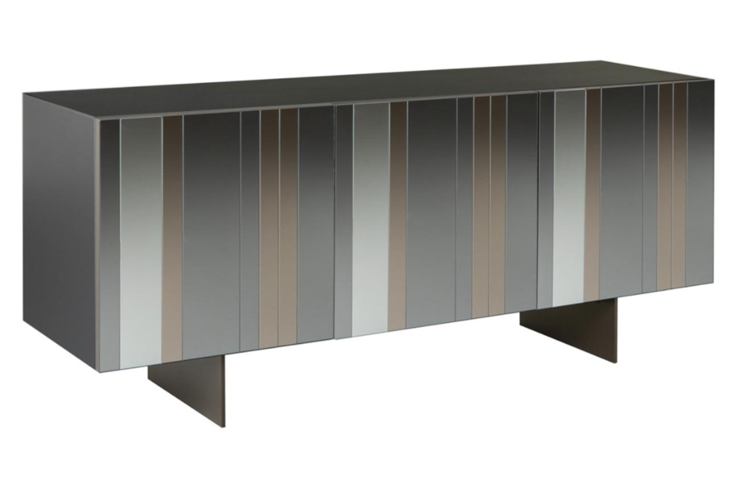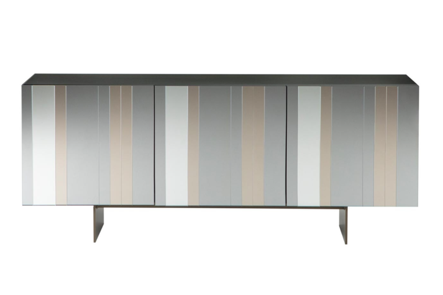 The Divana sideboard is a statement piece that draws all eyes in a modern home. Its linear design showcases an intriguing mix of differently colored mirrors, creating a dynamic interplay of movement and reflection. Perfectly blending aesthetic appeal with functionality, this sideboard offers ample storage behind its three or four doors, while its wide top invites creative decoration.