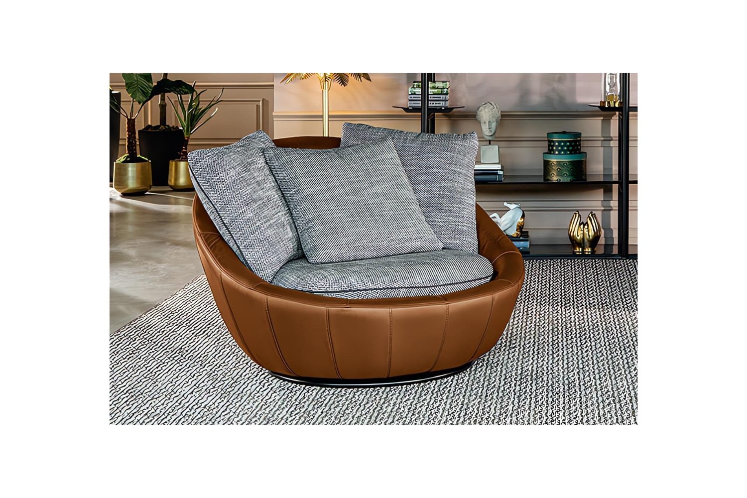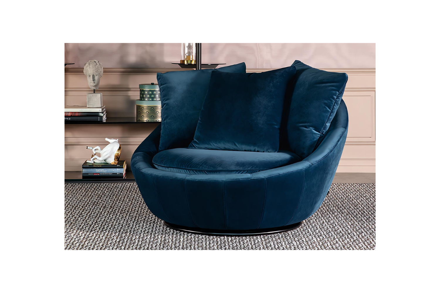 Immerse yourself in the cozy embrace of the Doppio Sogni Lounge Chair, a sanctuary of warmth and comfort. Its enveloping silhouette features a wide, accommodating body that cradles you as you unwind. With a soft, generous seat and three plush cushions for added support, this chair is designed to offer both relaxation and functionality. The swivel base allows for effortless movement, making it the perfect centerpiece for your living room—a true oasis of comfort and style.