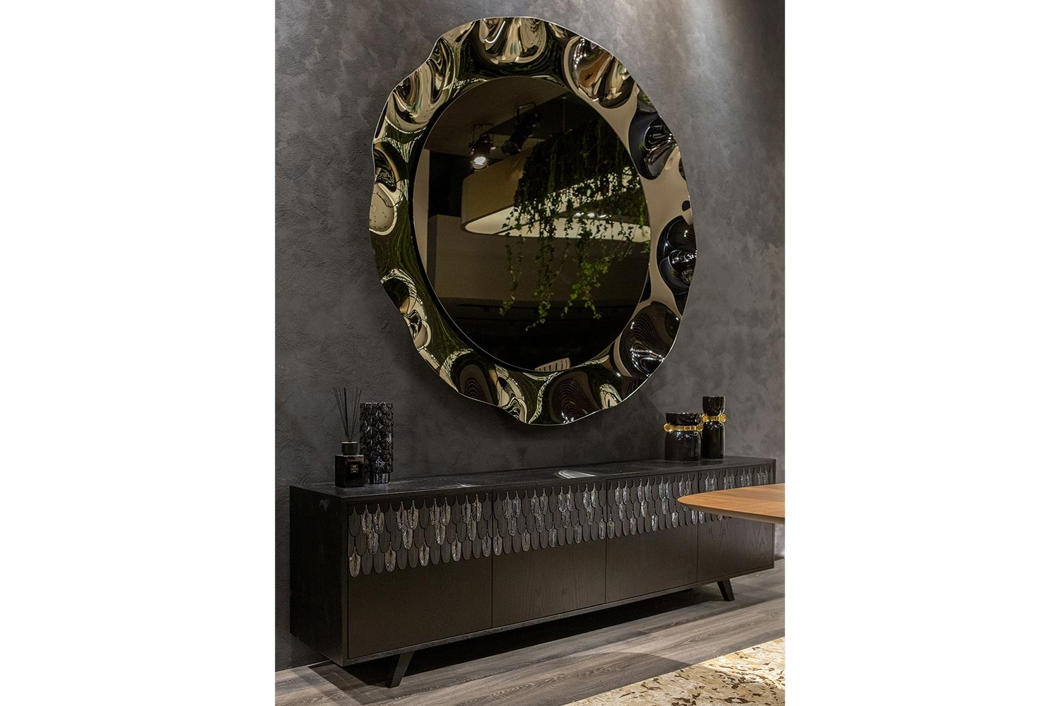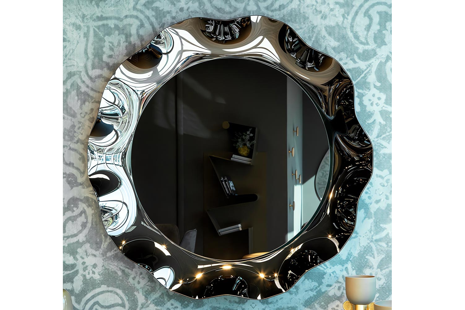 Inspired by a timeless character of literary elegance, the Dorion Round Mirror takes center stage in any room, combining artistry with function. Its gracefully round silhouette, enhanced by corolla detailing, evokes a delicate, wavy effect reminiscent of a blooming flower. Mounted on the wall, it creates a sculptural presence that draws the eye while fulfilling its purpose—helping you look your best with every glance.