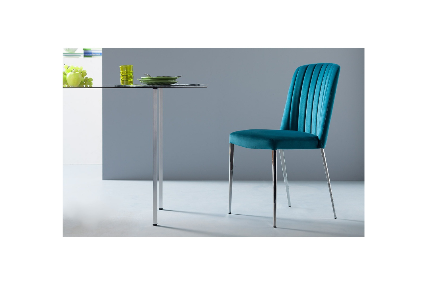 High back chair, metal frame with epoxy powdered tapered legs, polyurethane foam, upholstered with fabric, faux leather or real leather of italian origin. The chair can be produced with bicolour upholstery. Curved and ergonomically shaped seat.