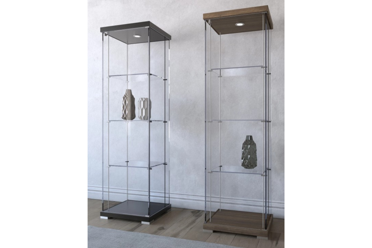 Egoe is a sophisticated display case that seamlessly blends style and functionality. Featuring a wooden base and top, its transparent extra-clear glass structure and shelves create an air of refined elegance. The integrated internal LED light highlights your displayed items, making Egoe a stunning addition to any contemporary space.