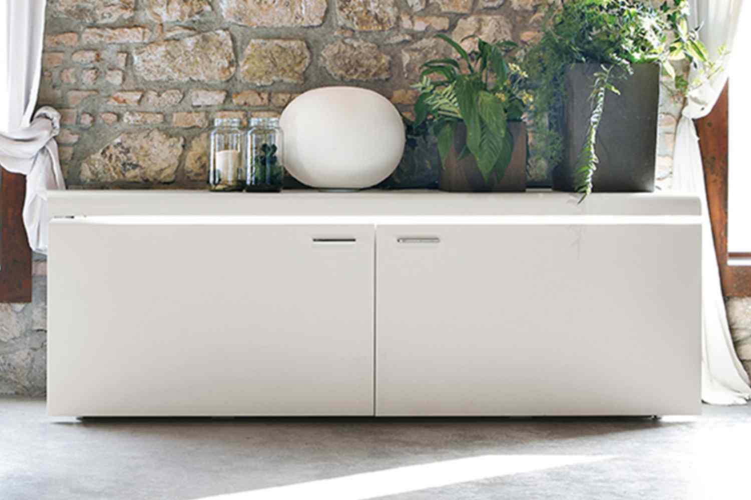 A neat and sleek sideboard showcasing standard doors that stay true to its core design principles: Goya embodies solidity, elegance, and a return to simple and clean forms. Optional features, like a top LED light, introduce a hint of contemporary flair.