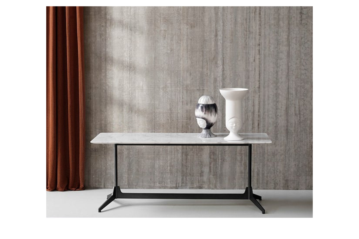 The project draws inspiration from the concept of memory, transforming simple and iconic forms with nostalgic echoes. At the core of the design is an upright hexagonal structure, reminiscent of the construction elements commonly found in buildings. In this unique context, it takes on the role of a joint where the feet are attached perpendicularly. This stylistic detail harks back to the furniture design of the 1950s. The table's base is crafted from painted finished metallic wire, while the top features luxurious marble.