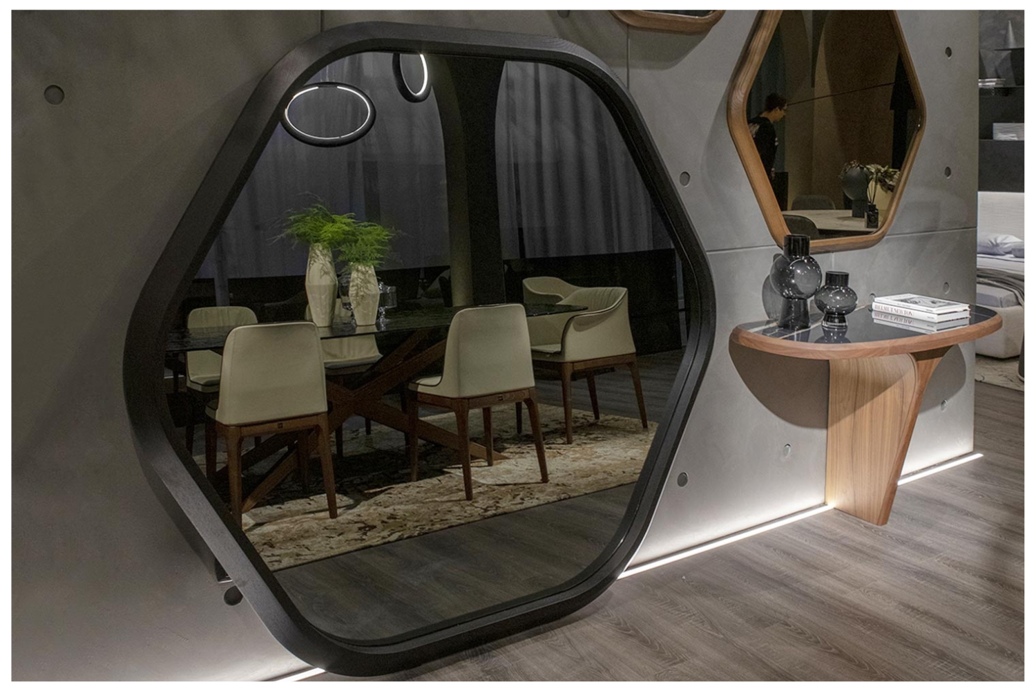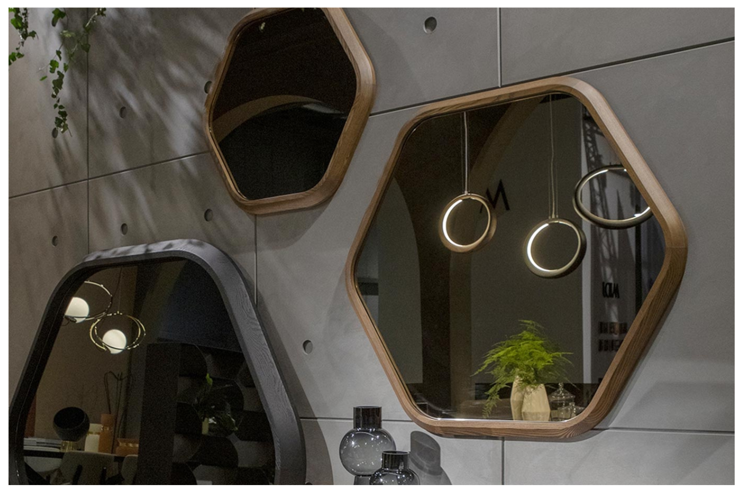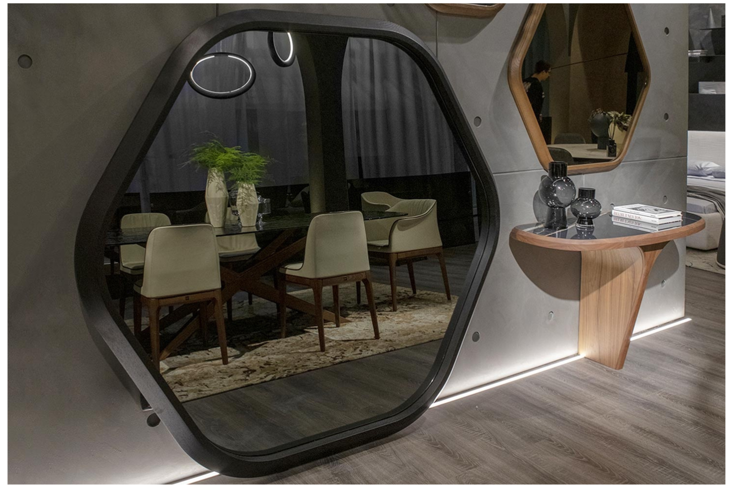 The Hiva mirror is a bold fusion of natural inspiration and geometric precision, designed to enhance modern interiors. Its six-sided silhouette, reminiscent of a honeycomb, embodies both the organic flow of nature and the structured elegance of geometry. Available in three versatile sizes, it offers endless opportunities for creative wall compositions. Whether displayed individually or grouped, the Hiva mirror combines style and functionality, serving as a reliable reflection piece and a striking decor element.
