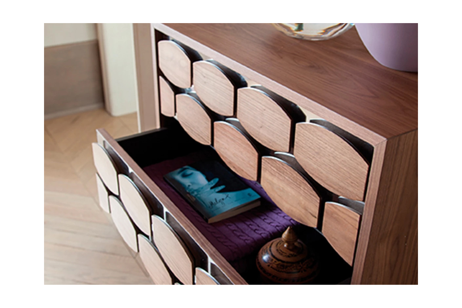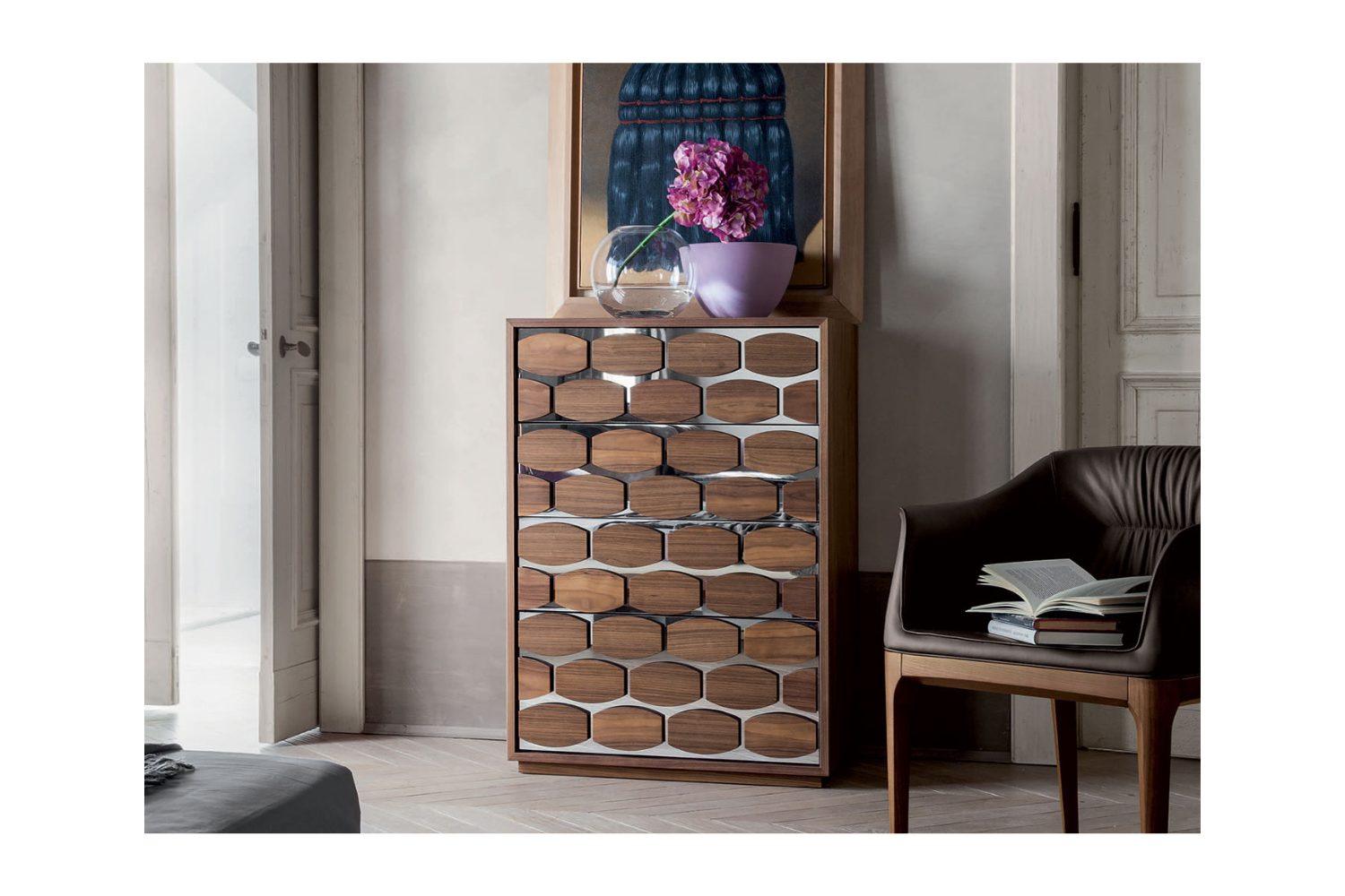 The Honnie Night Chest is a striking and functional piece that effortlessly enhances the modern bedroom. Inspired by the natural beauty of honeycombs, its front design combines wood and mirrored glass for a sophisticated, eye-catching look. With four spacious drawers for organized storage and a sleek top surface perfect for displaying your favorite décor, the Honnie Night Chest brings both style and practicality to your home.