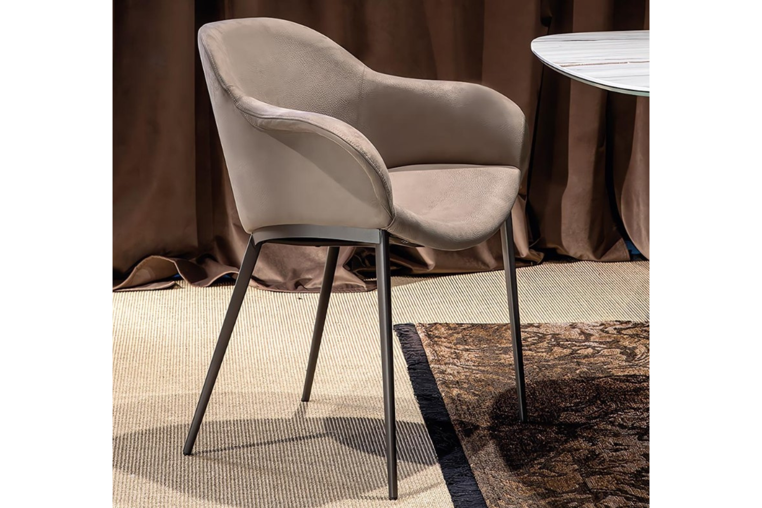Embrace unparalleled comfort and style with the Huggy Metal Dining Chair, designed to enhance any dining experience. Its sinuous, curved lines gently define the seat, backrest, and armrests, creating a welcoming embrace that invites relaxation. The sleek metal legs offer a striking contrast to the soft upholstery, adding a modern touch to the chair’s inviting form. This versatile design effortlessly complements contemporary dining tables, making it a perfect fit for any dining space. Available in two versions— with or without arms—you can tailor the chair to suit your style. Choose from a wide selection of leather, eco-leather, and fabric options in various colors and textures, allowing you to create a bespoke seating solution that perfectly aligns with your vision. The metal legs are available in three stunning finishes: Carbon Grey, Stone Bronze, and Matte Gold, offering the ideal finishing touch to this sophisticated chair. Indulge in comfort and elevate your dining area with the Huggy Metal Dining Chair.