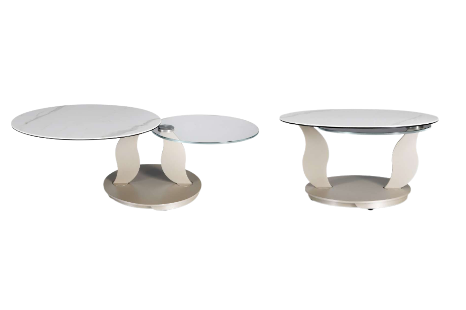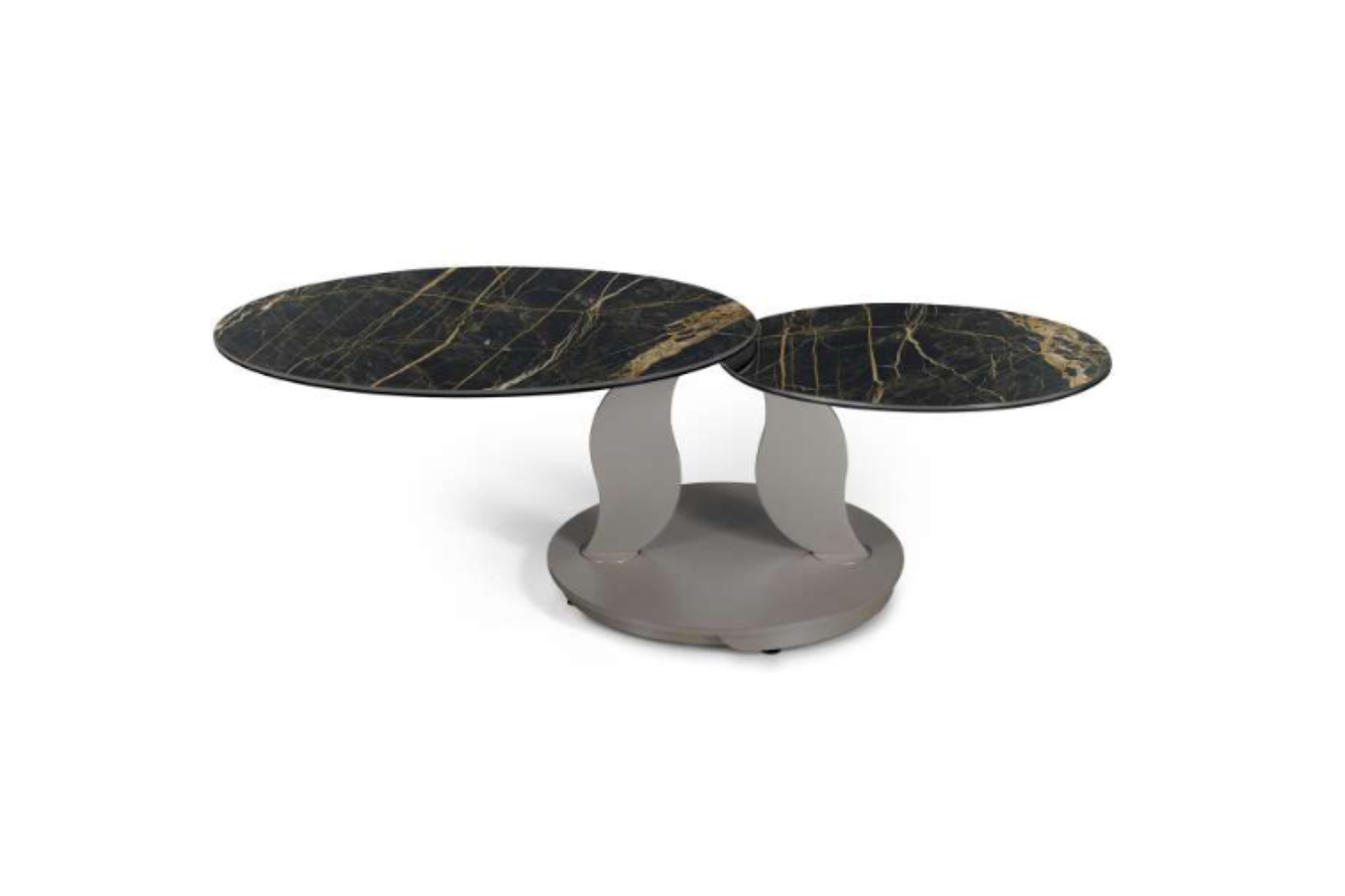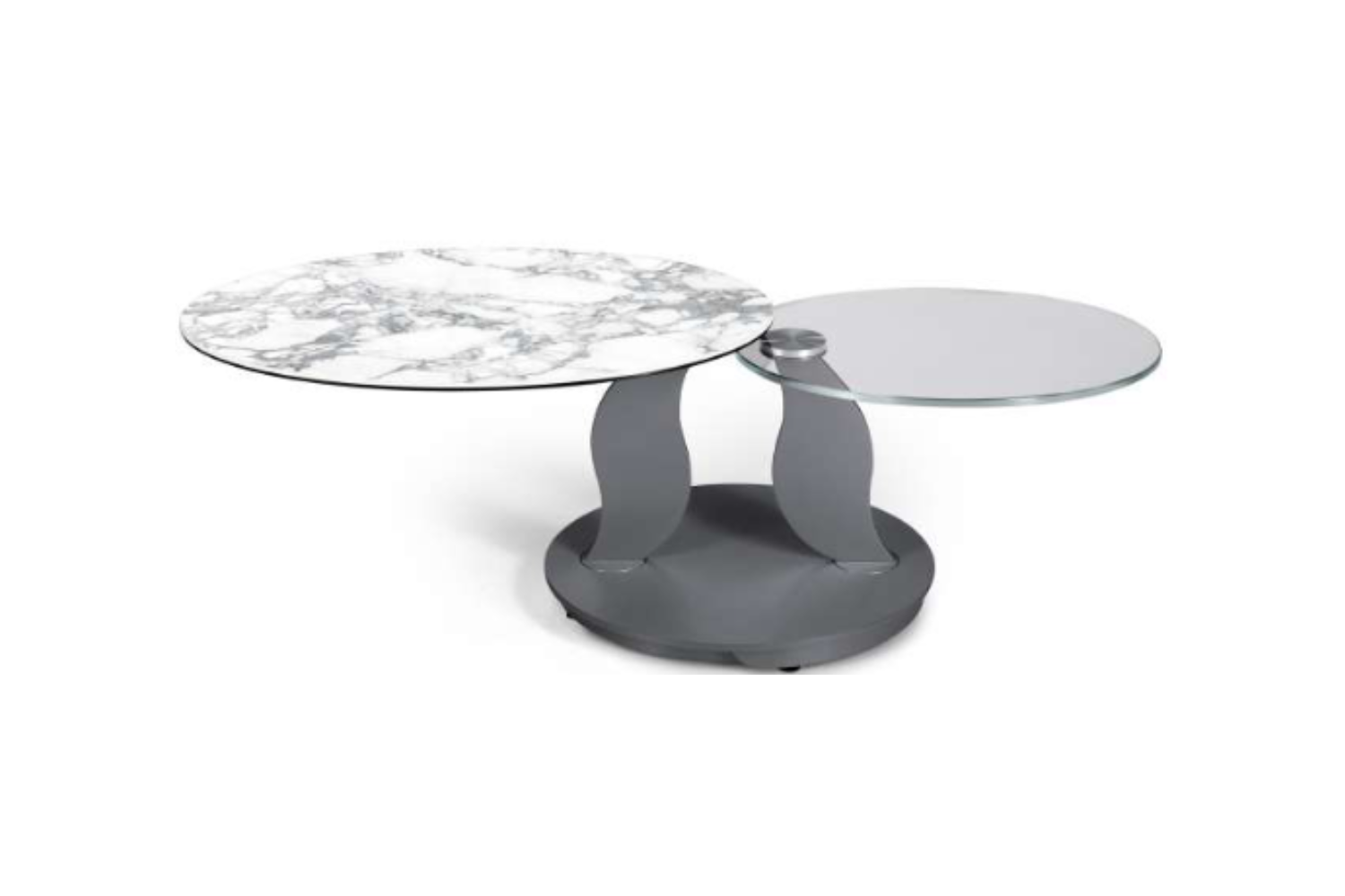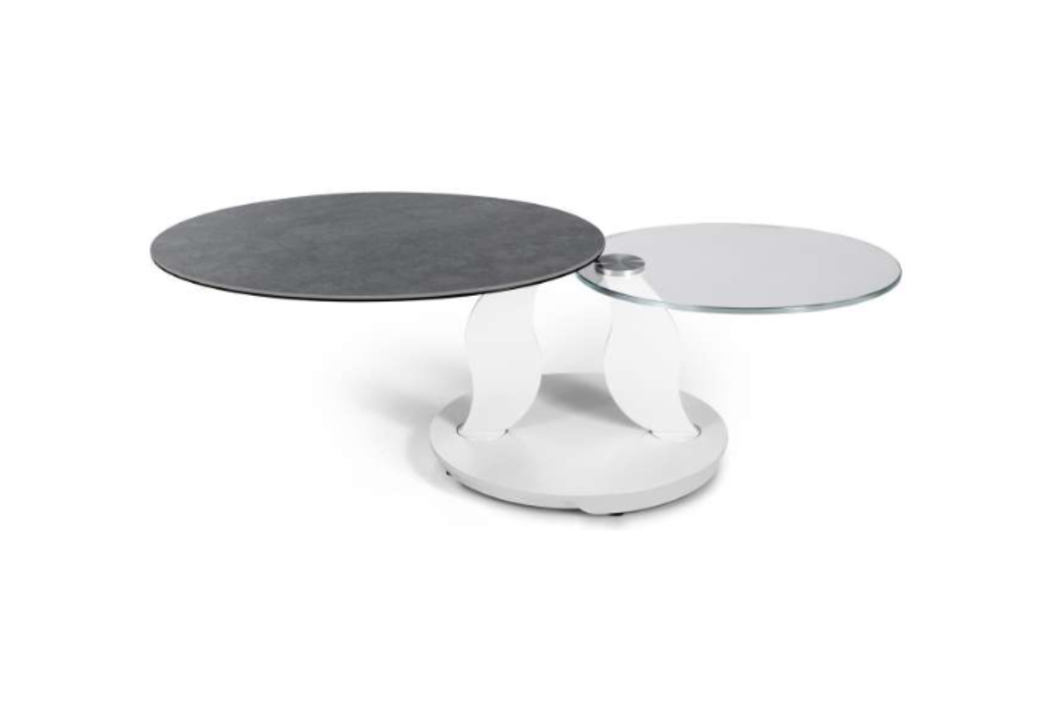 LEFANI | Extendable Cocktail Table Lefani is a contemporary cocktail table designed for movement, style, and versatility. Its synchronized revolving tops—offered in a selection of sophisticated glass or ceramic finishes—gracefully expand to transform both shape and function. The streamlined base and supports, finished in a palette of refined painted tones, conceal a precision mechanism that enables smooth, coordinated rotation. A statement of modern Italian craftsmanship, engineered for adaptable living.