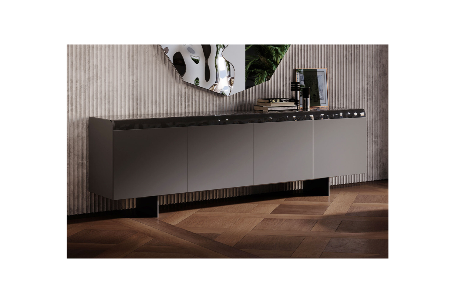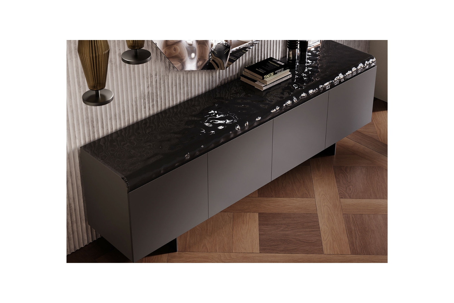 Transform any living space into a refined retreat with the Magmara Sideboard. This sleek, sophisticated piece captures attention with a near-seamless facade accented by the striking texture of black hammered glass, reminiscent of natural volcanic rock. Designed to make a statement, Magmamara isn’t just about looks; it offers practical storage with three or four spacious compartments featuring glass shelves, as well as a generous top for displaying or organizing essentials. A true blend of elegance and utility, this sideboard embodies the essence of functional luxury.