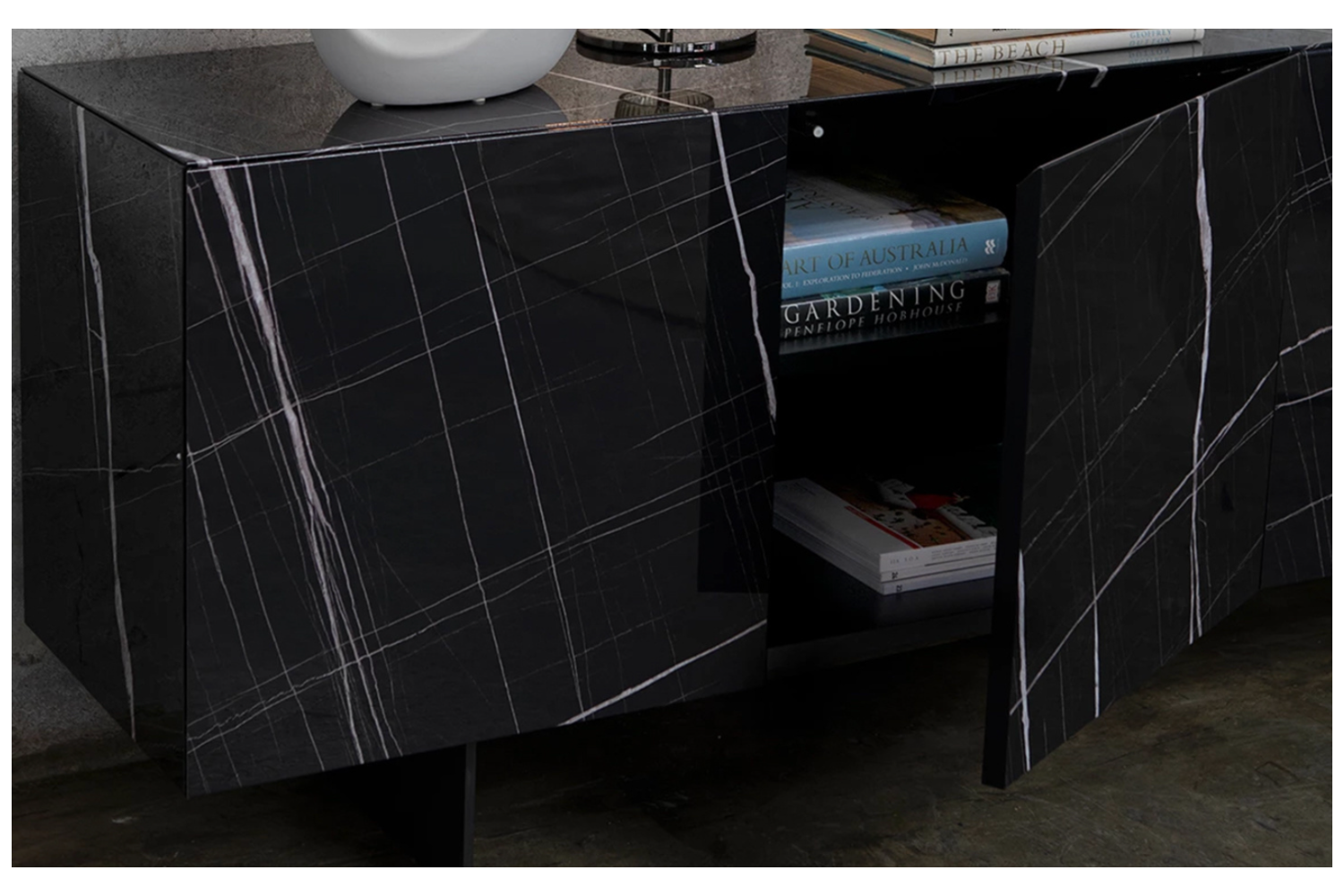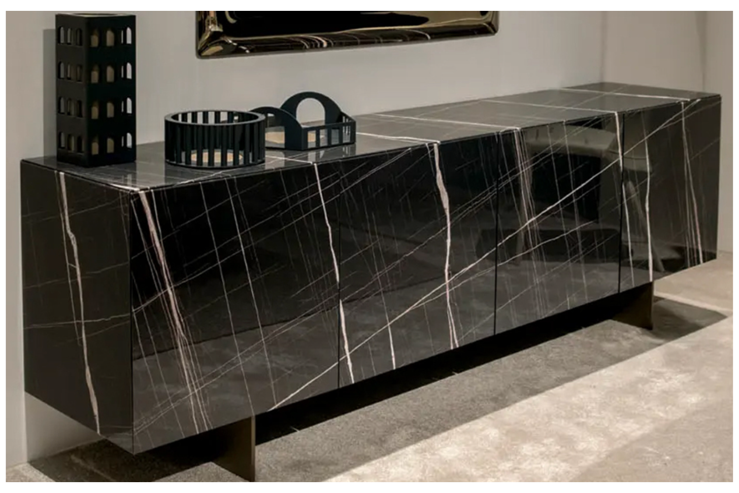 The Monolyth Sideboard delivers both style and practicality, making it a striking addition to any modern living or dining space. Its sleek four-door design offers generous storage while exuding elegance with its bold ceramic finish. Resting on refined metal legs, this piece is as functional as it is visually captivating. Choose from: Finish: Black ceramic across the doors, sides, and top. Leg options: Carbon grey or stone bronze metal. Elevate your home with the Monolyth Sideboard's impeccable Italian craftsmanship.