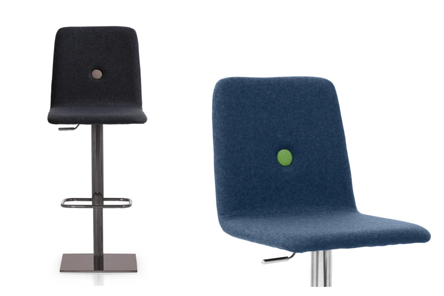 Adjustable and swivel stool with cast iron ballast covered with stainless steel cover, gas piston, footrest, seat and backrest made of beech plywood covered with polyurethane rubber and upholstered in fabric, imitation leather or genuine cowhide of Italian origin. Matching or contrasting button on the seat.