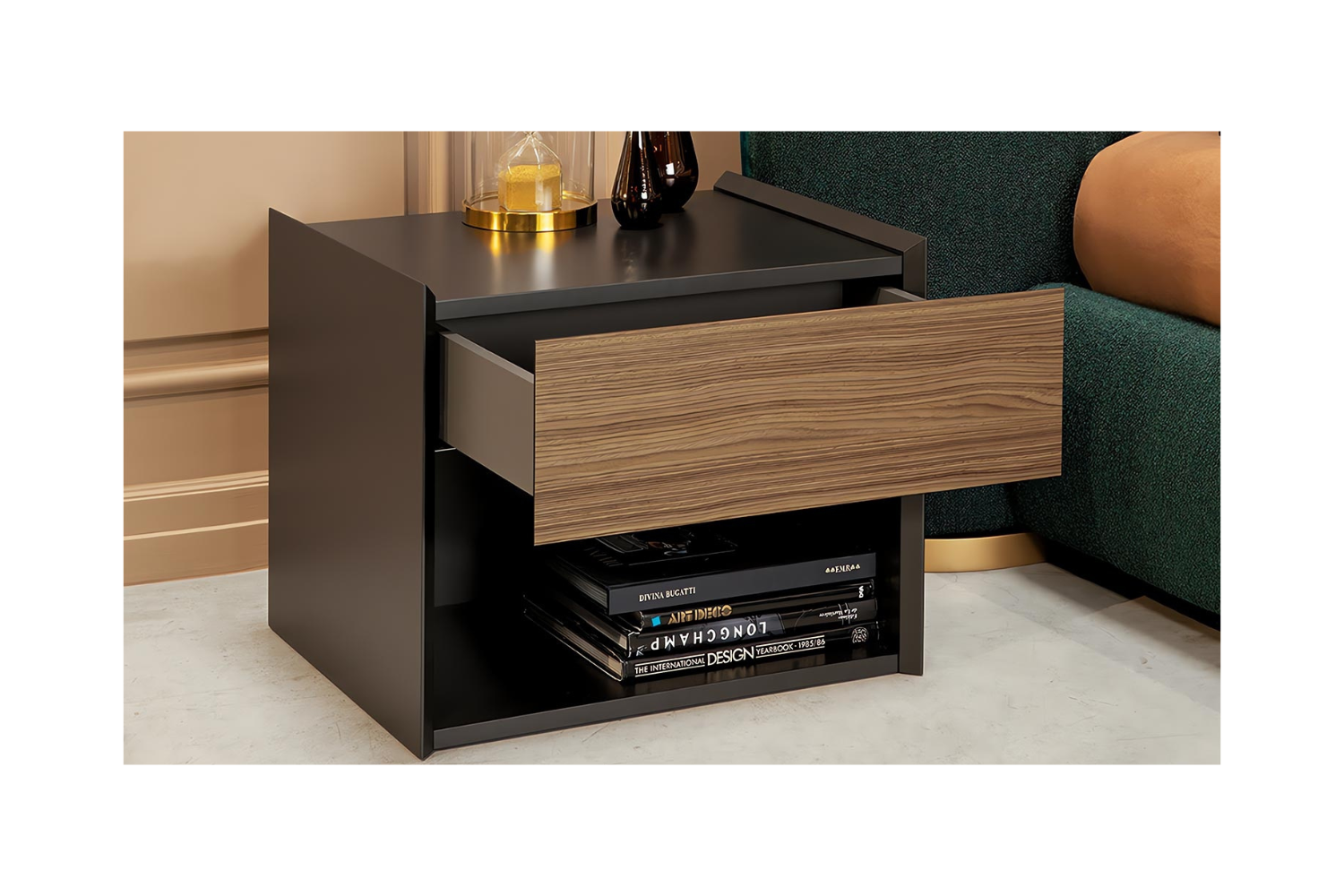 A bold statement in geometric design, the Orazia Nightstand is a perfect blend of form and function, elevating the modern bedroom with its striking silhouette. Defined by solid, well-structured shapes, this nightstand features a wide, cubed body and a blocky pull-out drawer. The spacious drawer, combined with the open compartment beneath, offers plenty of room to store books and essentials, keeping your nighttime routine organized and accessible. The top surface provides ample space for a lamp, decor, and anything else you prefer to keep within easy reach.