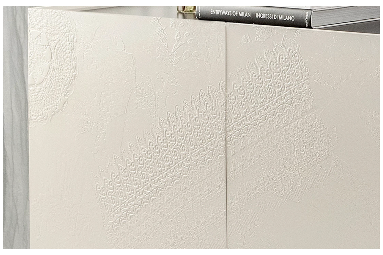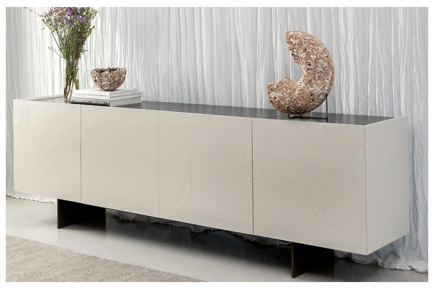 The Pezza Contemporary Sideboard elevates your space with its artistic charm and practical design. Featuring a striking three-dimensional overlay inspired by timeless paisley patterns and delicate lace motifs, this sideboard adds a luxurious and whimsical touch to any modern home. Made in Italy, the Pezza Sideboard offers a choice of two sizes with three- or four-door configurations to suit your needs. It is available in a natural clay finish or any RAL color, ensuring seamless integration into your decor. Sleek metal legs in carbon or bronze finishes add elegance, while an optional black or white glass top enhances its sophisticated appeal.