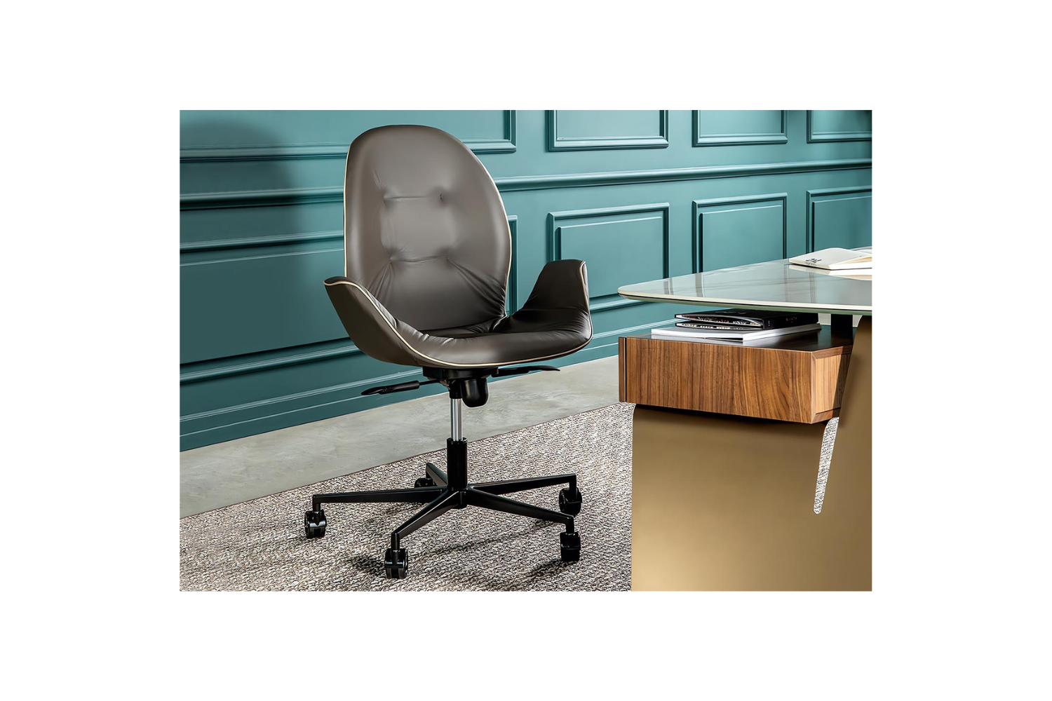 Achieve dynamic comfort and style with the Sorentin Office Chair. Crafted for the modern workspace, this chair features soft, sleek curved elements that mold to your body, offering both support and refined elegance. The button-tufted detailing adds a touch of sophistication, while the chair’s functionality ensures smooth movement and comfort throughout your workday. With five castors that glide effortlessly and an adjustable height mechanism, it allows you to find the perfect desk level with ease. Available in two versions—one with arms and one without—this chair can be customized with a wide range of upholstery options in fabric, leather, or eco-leather, all in various colors and textures. The base is finished in black painted aluminum for a sleek and sturdy foundation.