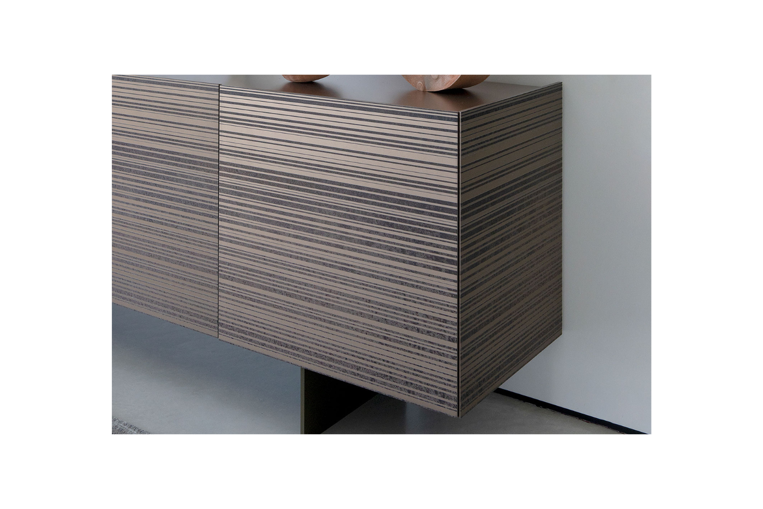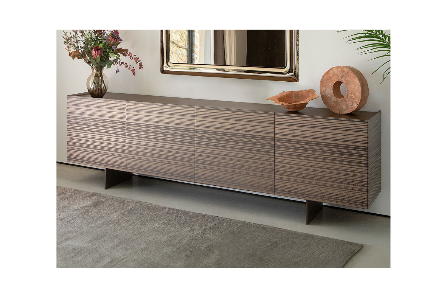 Elevate your home with the Strepia Sideboard, where classic design meets a modern twist. Crafted with a unique 3D embossed textured finish, this piece features dynamic stripes in varying widths, creating a bold visual presence. Its timeless silhouette effortlessly complements diverse interior styles, making it an adaptable addition to any contemporary living space. The spacious top provides the ideal setting for decor, plants, or cherished photographs, while the glass shelves inside offer practical storage for dishware and cutlery.