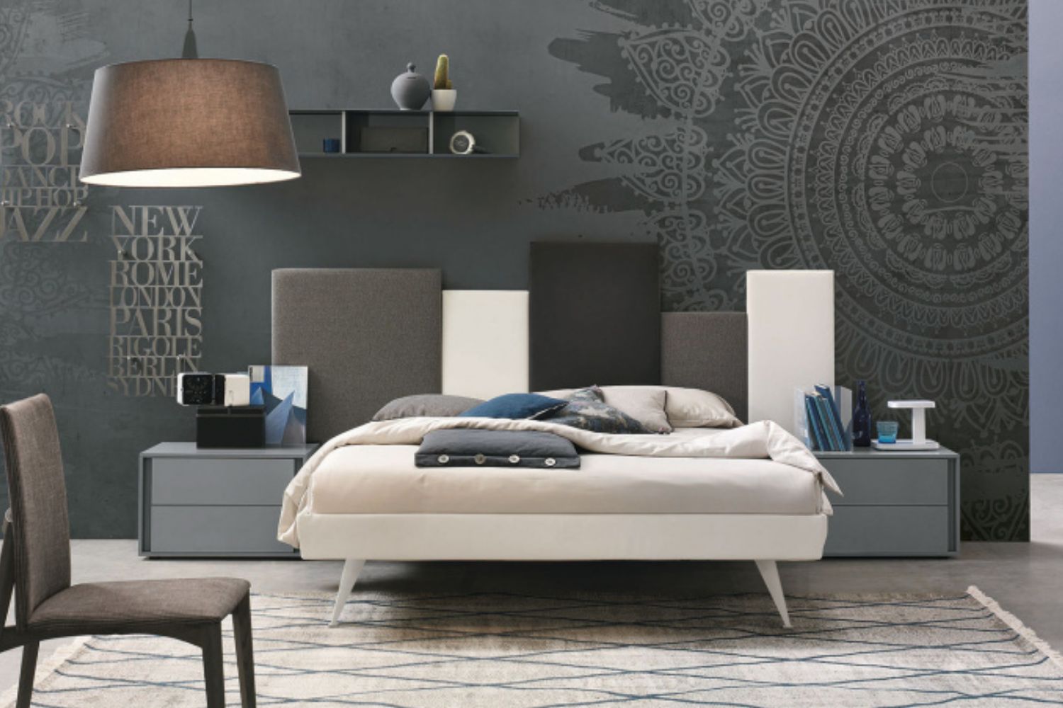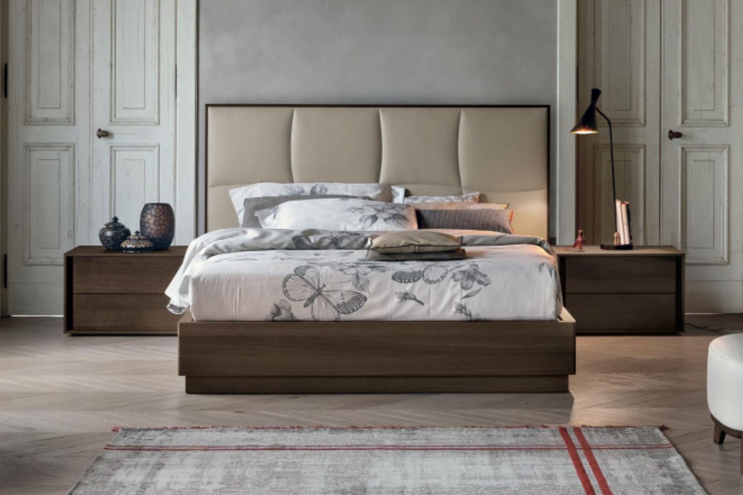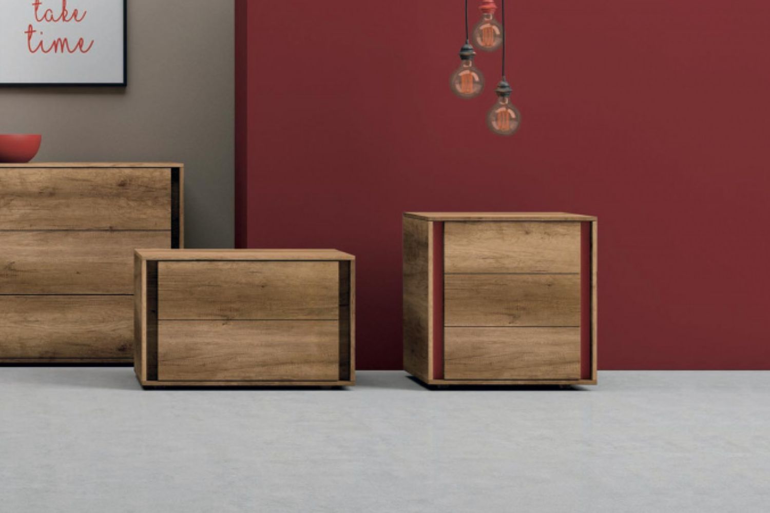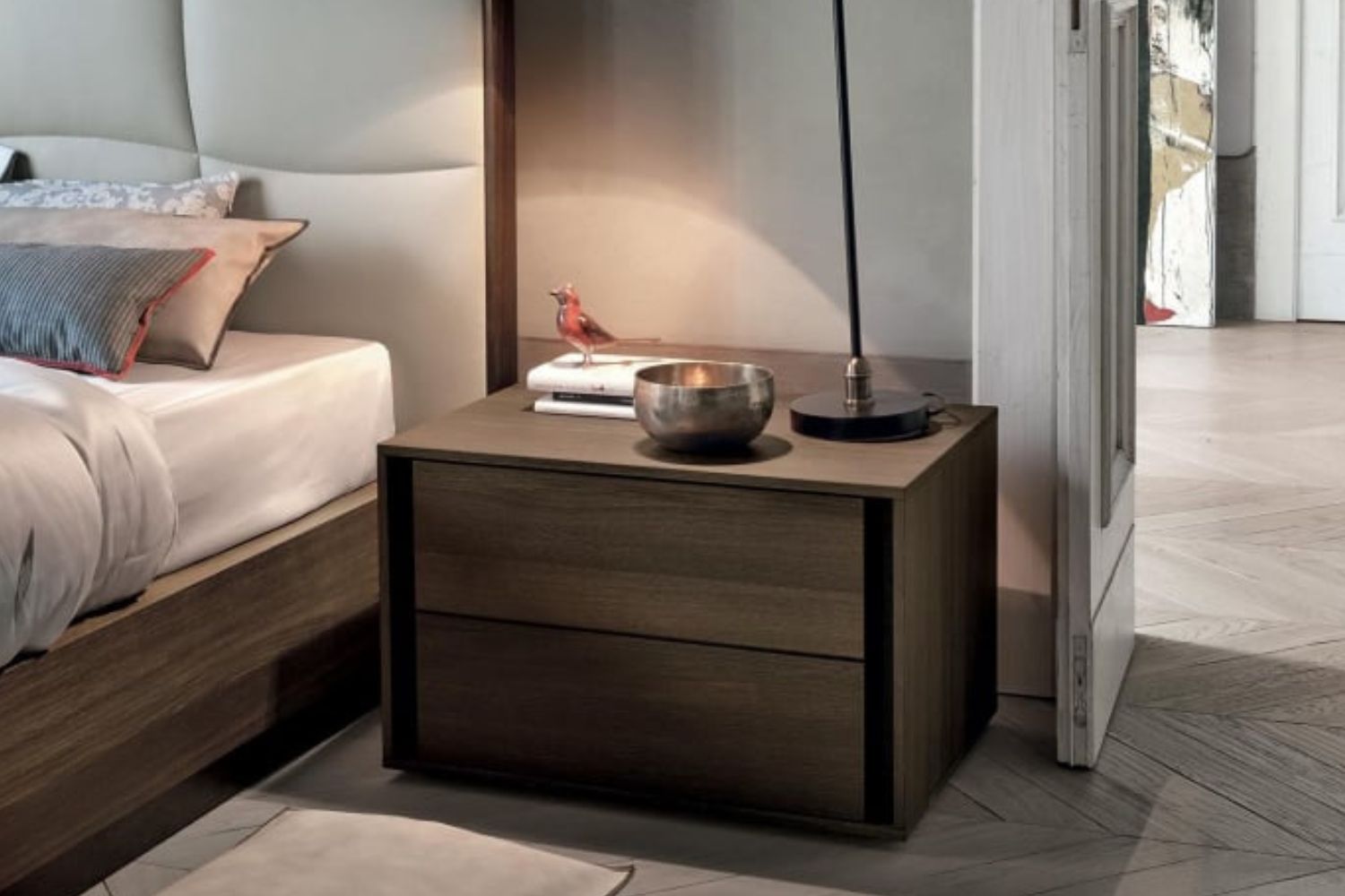 The shapes are rigorous while the structure outlines the fronts, creating the grip recess. The dark shade sets off the muted lines which contribute to the making of an elegant bedroom. Available in various finishes