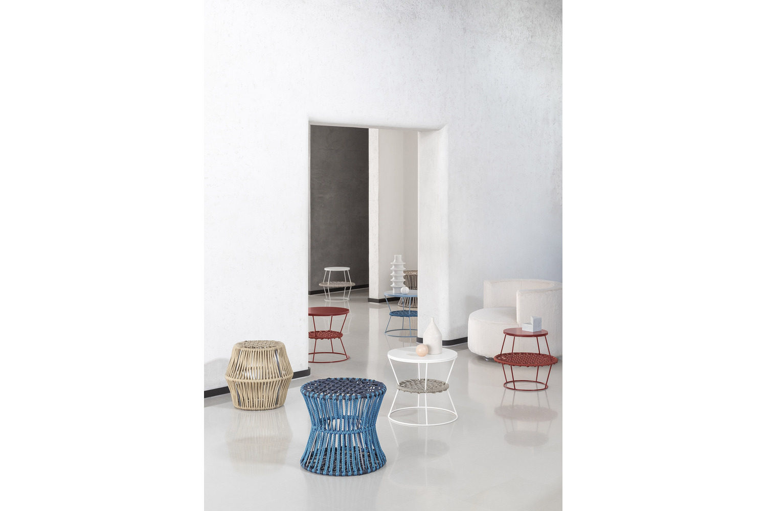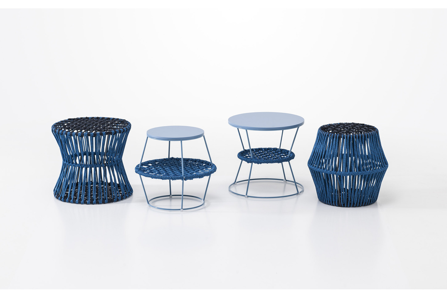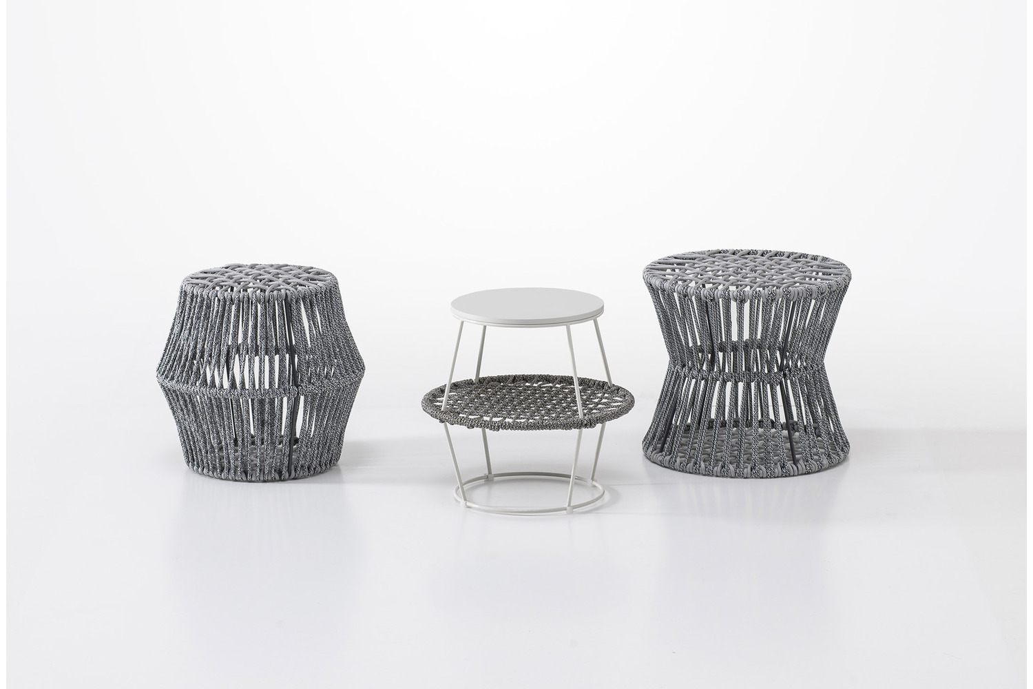 Common materials like rope, wood, and metal have been repurposed to change commonplace items. The coffee tables and poufs in this series are made from woven nautical ropes and metal rods that are mixed together like colors on an artist's palette. The deliberate allusion to David Bowie's well-known song Ziggy Stardust lends a sardonic edge to the idea of transforming accent furniture for the living room. The hourglass and barrel shapes come together to create enlarging islands, with volumes and weaving highlighted by the coordinating colors of mixed cable. This offers a novel way to outfit accessories that provide countless ways to customize the area. The two-tone plaited rope is a Saba-exclusive design.