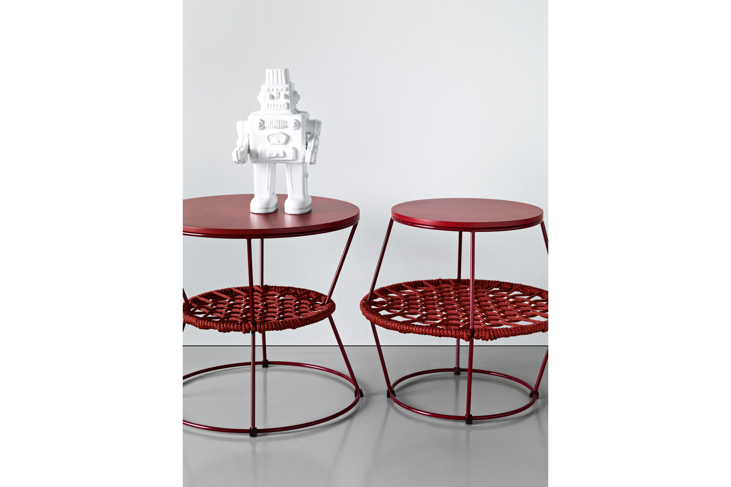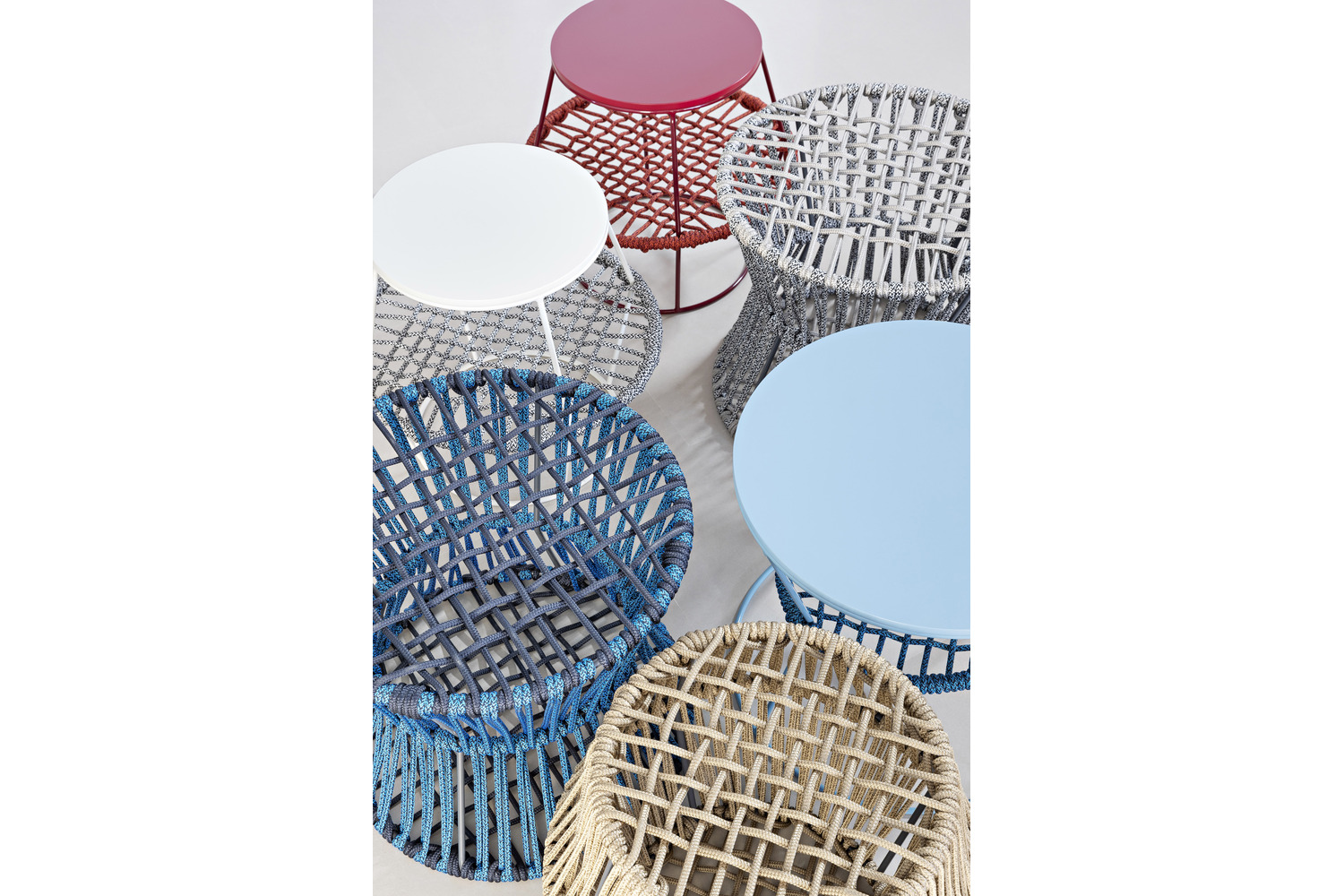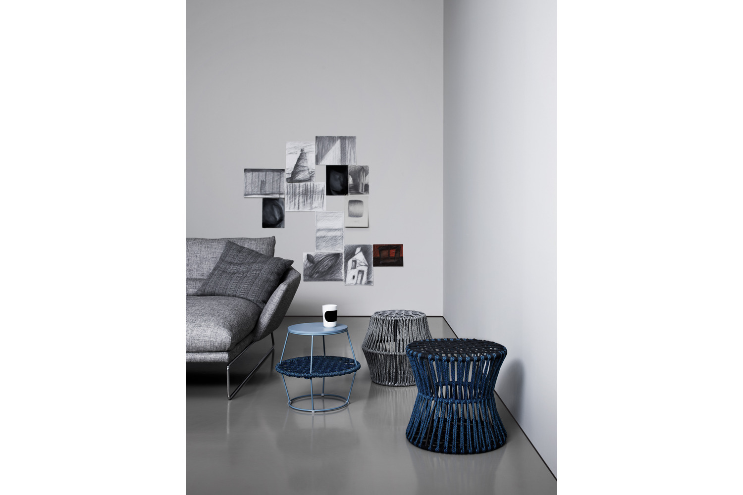 Common materials like rope, wood, and metal have been repurposed to change commonplace items. The coffee tables and poufs in this series are made from woven nautical ropes and metal rods that are mixed together like colors on an artist's palette. The deliberate allusion to David Bowie's well-known song Ziggy Stardust lends a sardonic edge to the idea of transforming accent furniture for the living room. The hourglass and barrel shapes come together to create enlarging islands, with volumes and weaving highlighted by the coordinating colors of mixed cable. This offers a novel way to outfit accessories that provide countless ways to customize the area. The two-tone plaited rope is a Saba-exclusive design.